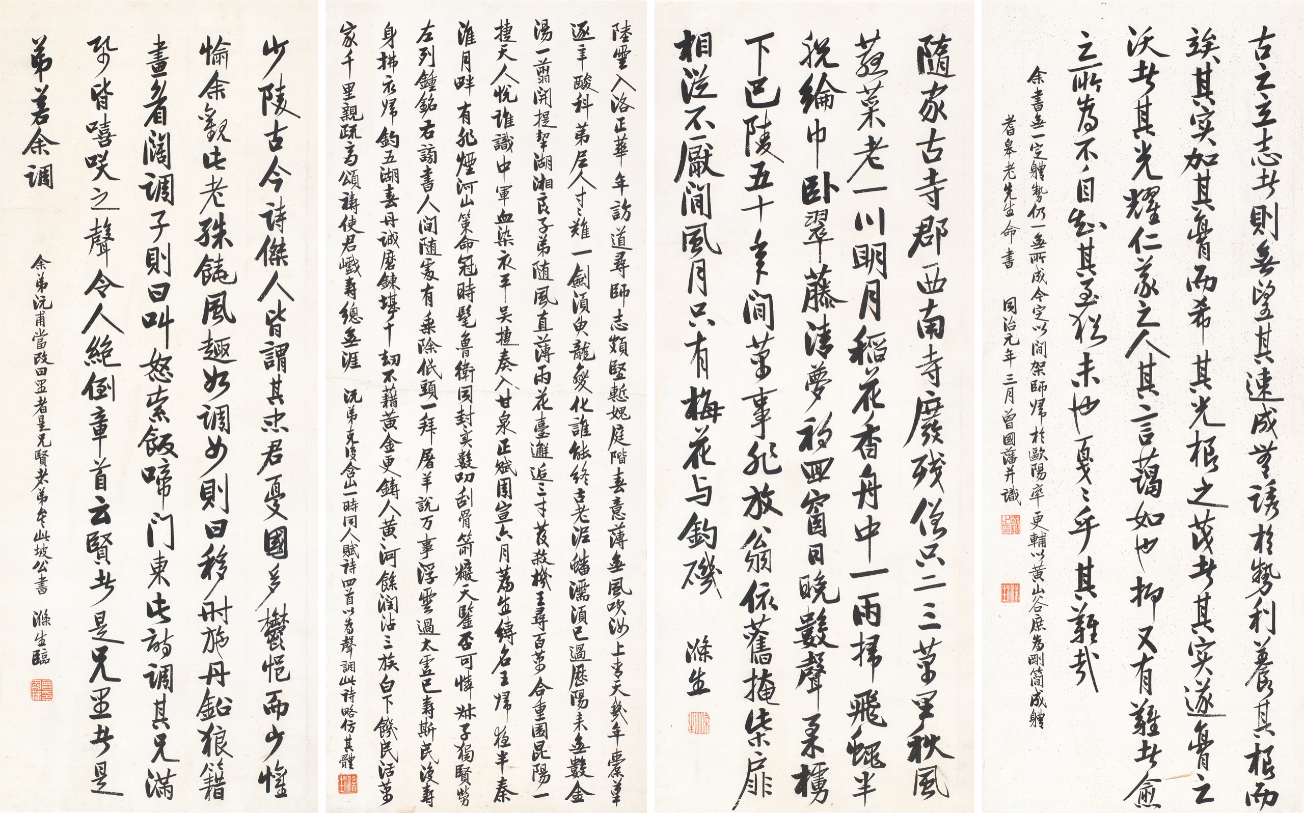 1:古之立志者,則無望其速成,無誘於勢利,養其根而竢其實,加其膏而希其光,根之茂者其實遂,膏之沃者其光耀,仁義之人,其言藹如也,抑又有難者,愈之所為,不自知其至猶未也。戛戛乎其難哉!余書無一定軆勢,仍一無所成,今定以間架師歸於歐陽率更、輔以黃山谷,庶為剛簡成軆。耆皋老先生命書,同治元年三月,曾國藩并識。2:隨家古寺郡西南,寺廢殘僧只二三。萬里秋風菰菜老,一川明月稻花香。舟中一雨掃飛蠅,半脫綸巾臥翠藤。清夢初回窗日晚,數聲柔櫓下巴陵。五十年間萬事非,放翁依舊掩柴扉。相從不厭閒風月,只有梅花与釣磯。滌生。3:陸雲入洛正華年,訪道尋師志頗堅。慙媿庭階春意薄,無風吹汝上靑天。幾年橐筆逐辛酸,科第尼人寸寸難。一劍須臾龍變化,誰能終古老泥蟠。濡須已過歷陽來,無數金湯一翦開。提挈湖湘良子弟,隨風直薄雨花臺。邂逅三才發殺機,王尋百萬合重圍。昆陽一捷天人悅,誰識中軍血染衣。平吳捷奏入甘泉,正賦周宣六月篇。生縛名王歸夜半,秦淮月畔有非煙。河山策命冠時髦,魯衛同封異數叨。刮骨箭瘢天鑒否,可憐叔子獨賢勞。左列鍾銘右謗書,人閒隨處有乘除。低頭一拜屠羊說,萬事浮雲過太虛。已壽斯民復壽身,拂衣歸釣五湖春。丹誠磨鍊堪千劫,不藉黃金更鑄人。黃河餘潤沾三族,白下飢民活萬家。千里親疏齊頌禱,使君眉壽總無涯。浣弟克復含山,一時同人賦詩四首以為聲調,此詩略仿其體。4:少陵,古今詩傑,人皆謂其忠君憂國。多鬱悒而少懽愉,余觀此老殊饒風趣,如調女則約移施丹鉛狼藉畫眉闊調子則曰:叫怒索飯啼門東。此詩調其兄,滿□皆嘻咲之聲令人絕倒。章首云:賢者是兄里者是弟,若余調。余弟浣甫當改曰里者是兄賢者弟矣,此坡公書,滌生臨。