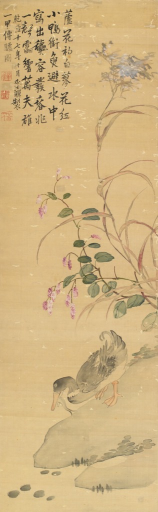 蘆花初白蓼花紅,小鴨銜魚避水中。寫出秋容發春兆,一聲雷響萬夫雄。乾隆十七年十月李鱓製,一甲傳臚圖。