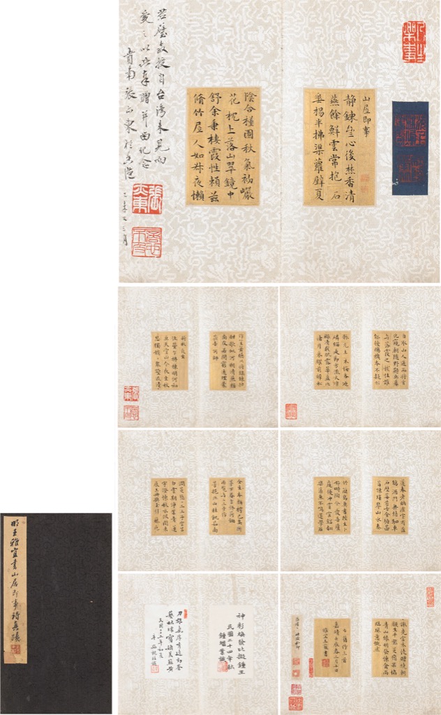 張亦東:張亦東(白二鈐)、商不及也(朱二鈐)。王寵:王寵私印(白)。鍾繼業跋:鍾繼業印(朱)。辛淼跋:辛淼(朱)。題簽:廬子樞(白)。收藏印:人生樂事(白)、海上畊煙舊廬(白)、映璣(聯珠印)、盛卿鑑藏(朱)、每逢佳節倍思親(朱)、□齋考藏書画(朱)、映璣私印(朱)、張璿之(白)、南海黃君璧藏(朱)、綠園寶藏(白)。
