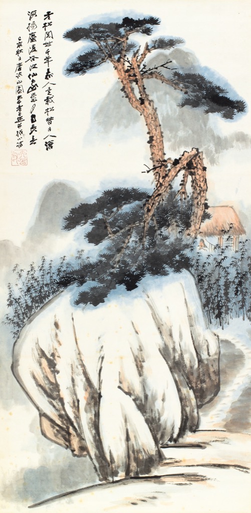 大千先生最可貴處在於不僅能得古人之形,更能得古人之神。全畫筆墨精妙,氣韻生動,虛實相生,超然脫俗,既有石濤的生活氣息,又有八大的空靈之境。古松其一挺拔向上,右則向下折彎尤如迎客松之姿,下方山石沉穩厚重,山勢之間留白處雲霧繚繞,形成生動的氣韻流動。茅舍竹林安排得當,既點綴畫面,又點明主題;此間高士形象雖小,卻是畫眼所在,引領觀者進入畫境。畫家將石濤的奔放與八大的含蓄完美融合,形成了自己獨特的大千藝術,展現了對文人畫精神的深刻認識之實踐,為傳統山水畫注入了新生命力。