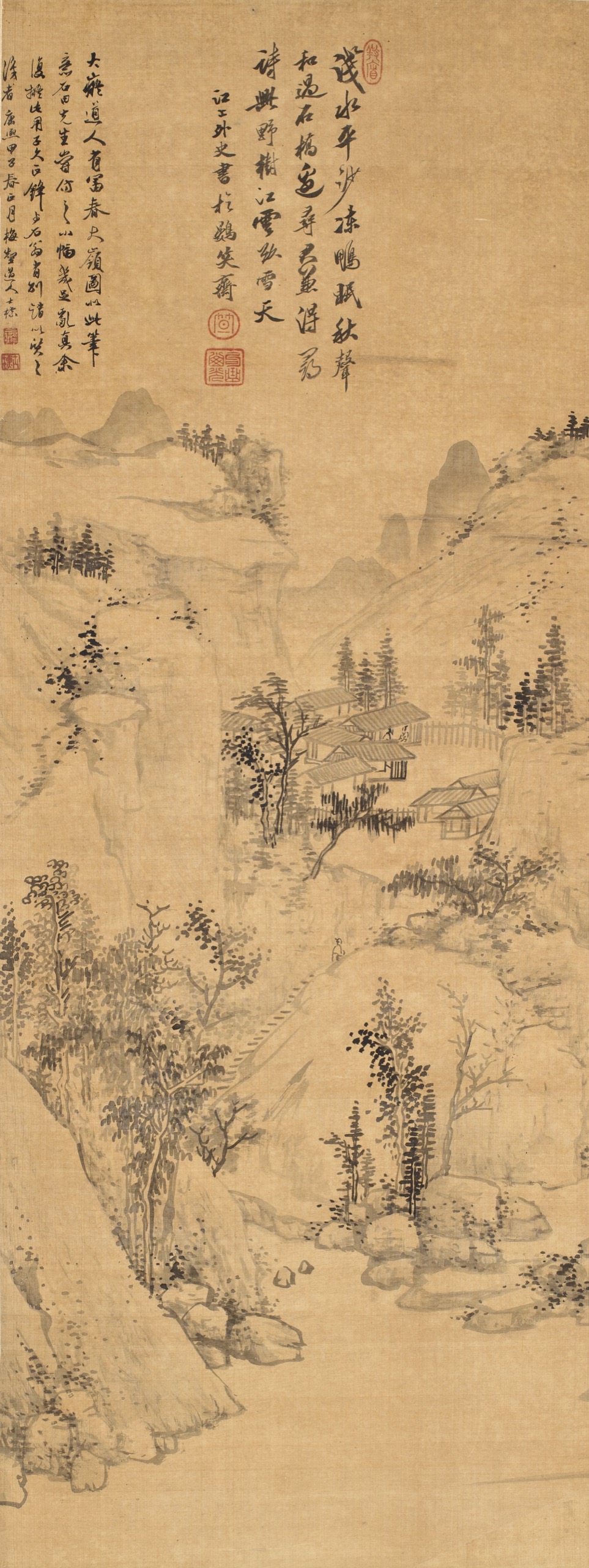 大癡道人有富春大嶺圖,以此筆意石田先生嘗仿之小幅,幾足亂真,余復擬此,用子久正鋒與石翁有別,諸以質之澹者。康熙甲子春正月,梅壑道人,士標。
