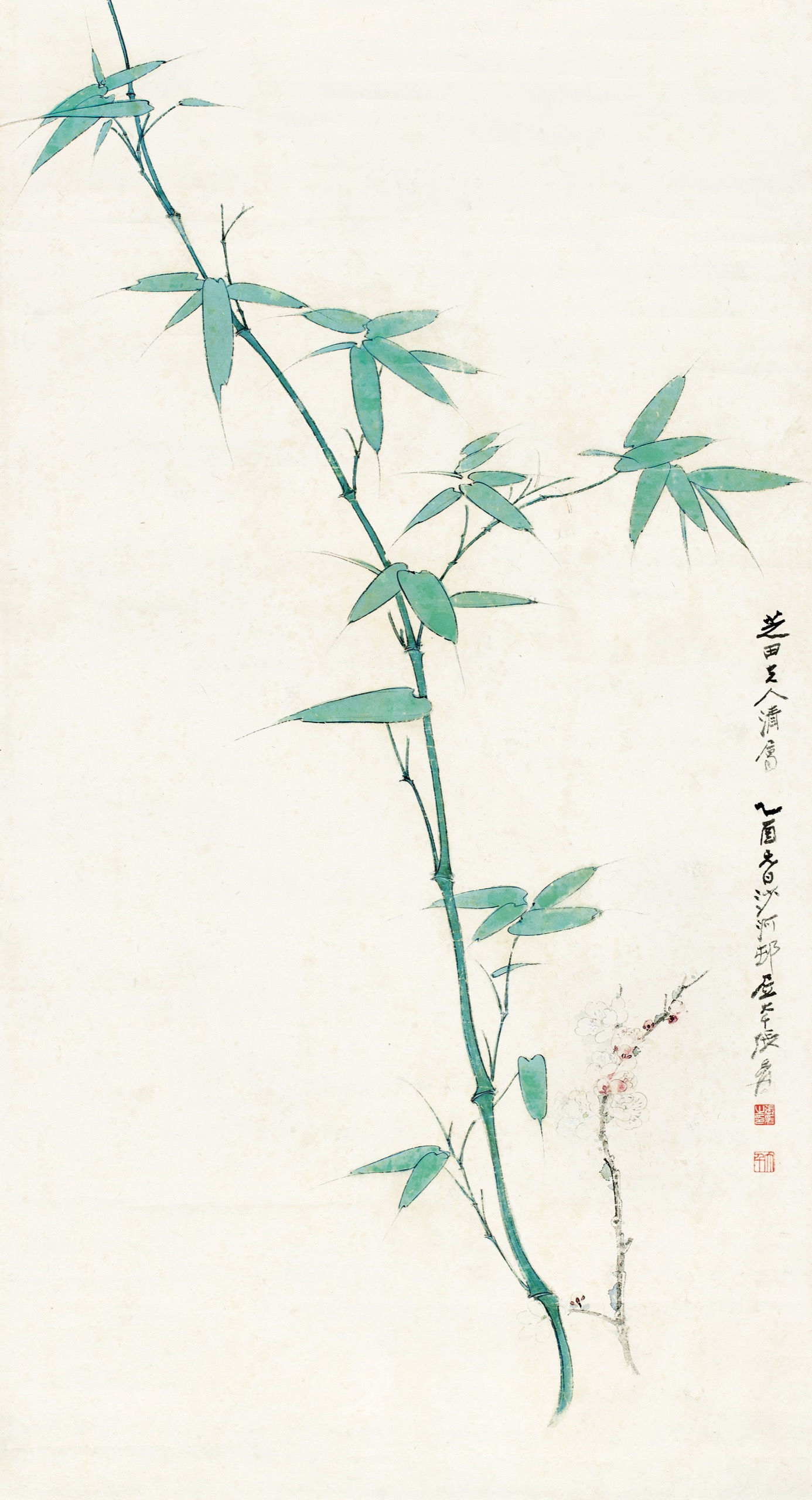 乙酉元日(1945年2月13日),正值抗戰烽火未歇之際,張大千隱居成都沙河村舍,以新春開筆之吉時,為「芝田夫人」繪就此幀《梅竹雙清圖》。此作不僅承載了歲首開筆的傳統雅意,更寄託了畫家對友人的深厚情誼與美好祝願,堪稱其工筆創作巔峰期融匯人、時、地三緣的精誠之作。