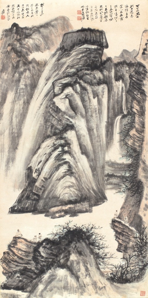 張大千此幅以游歷雁蕩山三折瀑寫景的雙題山水,堪稱其藝術成熟期「以古法寫造化」的典範。畫中先後融入石濤(清湘)與董源(北苑)兩家筆意,並通過精心布置的多重人物點景,構建出一幅兼具自然生機與人文理想的山水勝境。