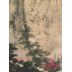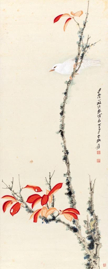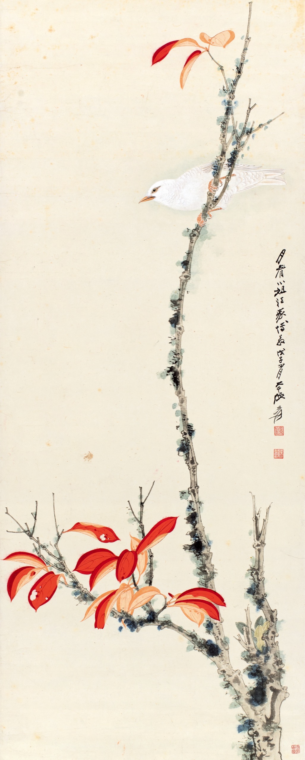上款人:「月眉小姐」係謝月眉(1906-1998),謝玉岑(1899-1935)之胞妹。謝月眉名卷若,江蘇常州人,女畫家,終身未嫁,長期隨三弟謝稚柳、陳佩秋夫婦寓居上海。民國時期中國女子書畫會發起人之一,其24 歲所作《牡丹圖》刊於中華書局1931 年《當代名人畫海》。1931年,謝玉岑與張善孖、張大千、黃賓虹同住上海西門路西門裡。最初謝玉岑由張善孖介紹給張大千認識,兩人一見如故,志趣相投,親密無間,成為知音。謝詩張畫,彼倡此和,珠聯璧合,為人珍視。他們還共同參與或發起成立了不少影響甚大的文人雅集和美術社團,如「秋英會」、「寒之友社」、「九社」、「蜜蜂畫社」、「中國畫會」、「藝海回瀾社」等。謝玉岑去世後,張大千題寫了「江南詞人謝玉岑之墓」。值得謝玉岑九泉之下欣慰的是,他跟張大千的交情,由他的胞弟謝稚柳、謝月眉延續了幾十年,直到張大千過世,始終不渝。賞析:此幅工筆紅葉小鳥係大千先生於1948年所繪,因受畫者亦是好友之胞妹且是海上知名女畫家,故大千先生自謙題寫「法家博教」。1938年至1948年,大千為抗日戰爭侵擾,曾多次進出成都郊外的青城山居於上清宮。在青城山的時間,大千靜心拋卻人間俗事,窮壯年之精力,專注於藝術創作,將山居所見種種異鳥奇卉美景通通入畫,這十年之間為其工筆花鳥的全盛時期,其取法乎上,經由明代的陳洪綬,上追宋人的工筆花鳥,如:滕昌佑、林椿、宋徽宗等,大千並養飼鳥禽作近身觀察寫生,臨古與寫生相結合,有言:「畫一種東西,必須要了解其理、其形(形即是態)、其情。鳥要活得靈活,方為佳品」,「翎毛無論工筆寫意,必須潤澤,若不潤澤,便是標本。」張大千曾有言「青城山中樟柟漆樹,未秋先紅,璀燦如錦」,創作此畫的時間是1948年,該時期大千飽覽青城山林美景,興致昂揚,憑仗著良好的目力、充沛的體力,以嫻熟的宋人技法繪下這幅青城山紅葉配白羽鳥禽之作品。畫幅右下枝幹斜升而上,墨彩層層渲染,帶有斑駁苔痕,分出枝枒,穿插其上的紅葉色澤光豔奪目,葉子不同面向的顏色深淺交待清晰,葉脈勾勒如絲,位置布局自然生動,下方數叢紅葉層疊交錯,最上方三片紅葉,上下呼應設色濃豔中不失雅致,色彩鮮明卻調和。最吸引觀者目光的焦點,莫過於棲於直上枝枒之白鳥,靈禽佇立,目光炯炯有神,似以生漆點睛,眼神凝視,翅腹尾羽皆工細有致,細觀鳥之腳爪站枝有勢有力,且描繪腳上的紋與爪更是一絲不苟,表現出畫之精神,靈動具活力。本幅紅白對比鮮明、色彩雅麗,渲染細膩,技法講究,紅葉對比著枝頭停駐的一隻白鳥,更顯潔淨與靜謐,正可謂妙筆傳神。