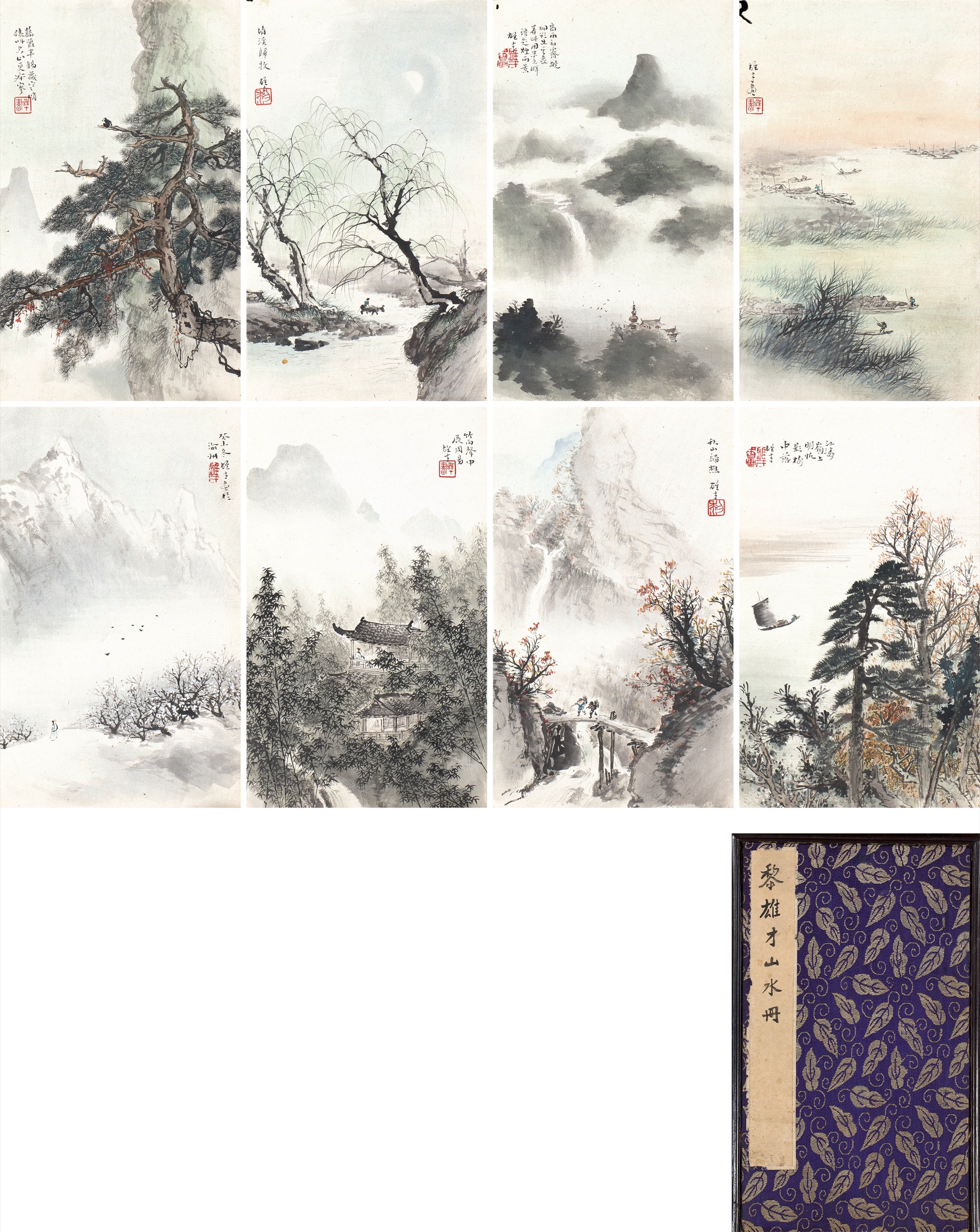 黃君璧題簽:黎雄才山水冊。1:雄才畫。2:宿雨初霽,曉烟欲出,其象若此。用米元暉語題煙雨景,雄才。3:清溪歸牧。雄才。4:藤蘿半錫藏寒峭,猿叫空山更寂寥。5:江濤嶺上明,帆影樹中落。雄才。6:秋山歸樵。雄才。7:竹雨聲中展周易。雄才。8:癸未冬,雄才畫於渝州。