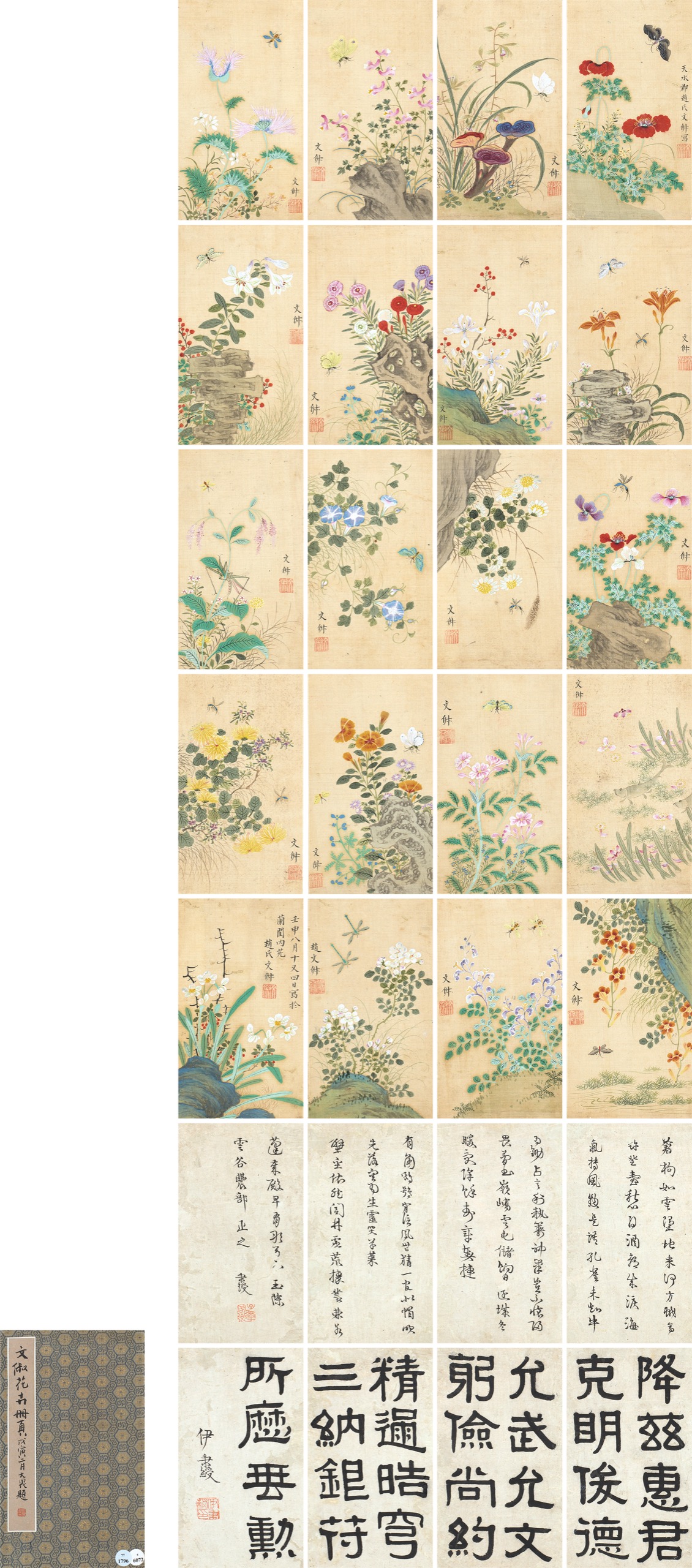 施大畏題簽:文俶花卉册頁。戊寅二月大畏題。1:天水郡趙氏文俶寫。2:文俶。3:文俶。4:文俶。5:文俶。6:文俶。7:文俶。8:文俶。9:文俶。10:文俶。11:文俶。12:文俶。13:文俶。14:文俶。15:文俶。16:文俶。17:文俶。18:文俶。19:趙文俶。20:壬申八月十又四日寫於蘭閨內苑,趙氏文俶。中間文略。降茲惠君。克明俊德。允武允文。躬儉尚約。精通皓穹。三納符銀。所歷垂勳。伊秉綬。