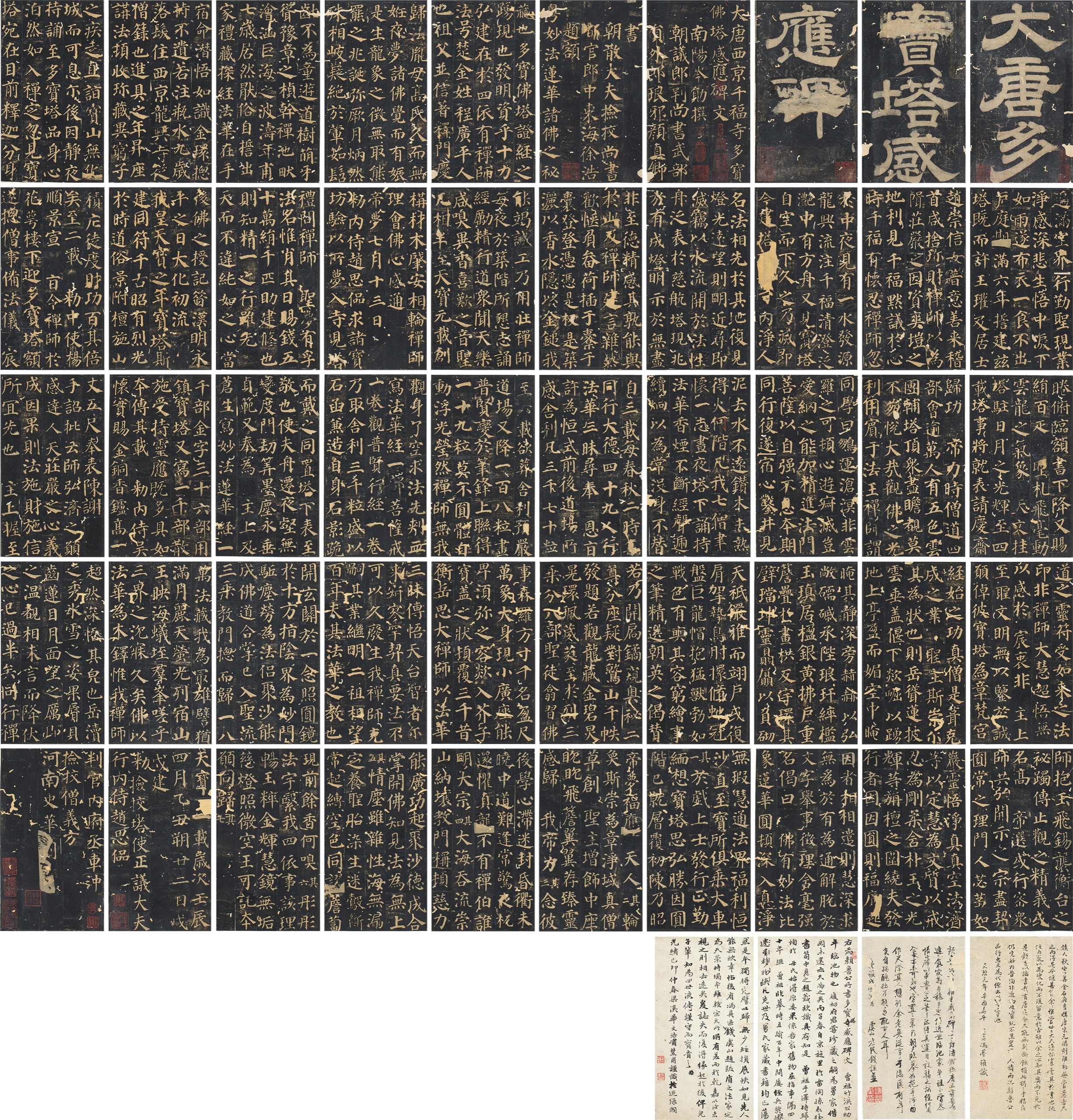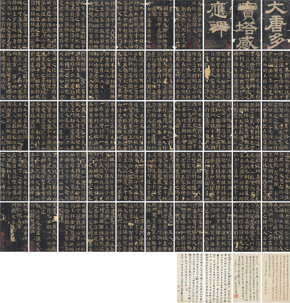 大唐多寶塔感應碑:南陽岑勛撰,朝議郎判尚書武部員外郎琅邪顏真卿書,朝散大夫撿校尚書都官郎中東海徐浩題額。(中間文略)天寶十一載。歲次壬辰。四月乙丑朔廿二日戊戍建。勑檢校塔使正議大夫行內侍趙思偘,判官內府丞車沖,撿挍僧義方,河南史華刻。馮夢禎跋:族人秋客,善金石癖,多購唐宋元榻刻雖夥,無當意者久之,而得是本愜甚。質余,余惟當世士大夫澹恨寡,當其於書也,純任勾籠以為變化,而不復留意於古,雖以余之心知其弊而不免於是,顧足以論書哉。有唐迄今久,能無剝断蝕損,此榻榻手精良仍完好如昔,洵非近物也。寶玩不忍置□□人情,而況顏魯公品行忠正、為代傑出,猶可寶也。天啟元年辛酉嘉平,具區馮夢禎識。錢謙益跋:顏魯公書《千福寺感應碑》真力彌滿,體極□正,兼有秀逸之氣,冣為勻穩多姿。乃近世臨池家鼻祖,正嘗參悟此碑以求魯公之筆法,得其運用旋轉之谿徑,猶有入處亦未可知也。當置之案頭朝夕臨摹,如挹手澤,勿作天際真人想。顧余老矣,從事于隱匿有年矣,自揣醜拙不能近配古人耳。崇禎戊寅冬月,虞山老民錢謙益。華文浩跋:右為顏魯公所書《多寶塔感應碑》文,曾祖竹溪公幼年臨池物也,履初府君嘗珍藏之,嗣為舅家借閱未還,亦久忘之矣。丙子春,自京旋里,於雷陶孫表姪書笥中見之,題籤款識具存,知是曾祖手澤。持歸,詢於母氏始得原委,果係吾家舊物,屈指事隔四十年,距曾祖臨摹時且踰百年,中間屢經兵燹(播遷星移物換)凡先世及舅氏家藏書籍均已蕩然,是本獨得完璧以歸無少蛀損,展帙如見先人,能無欣幸!帖後有馮具區、錢虞山題跋,質之法家定為天、崇時塌本,雖較宋元所塌有差,而於乾嘉以後者視之則相去遠矣。爰誌失而復得緣起於後,俾兒子輩知為四世流傳,謹守而寶貴之。光緒己卯仲春,梁溪華文浩嘯楚甫謹識於延綠閣。