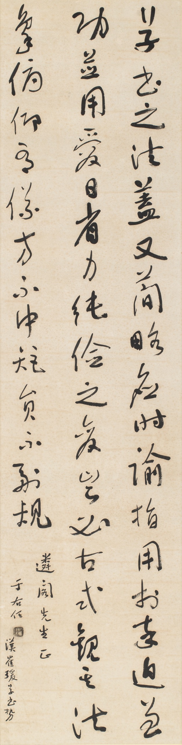 草書之法,蓋又簡略;應時諭指,用於卒迫。兼功並用,愛日省力;純儉之變,豈必古式。觀其法象,俯仰有儀;方不中矩,圓不中規。遴閣先生正,于右任。漢崔瑗草書勢。