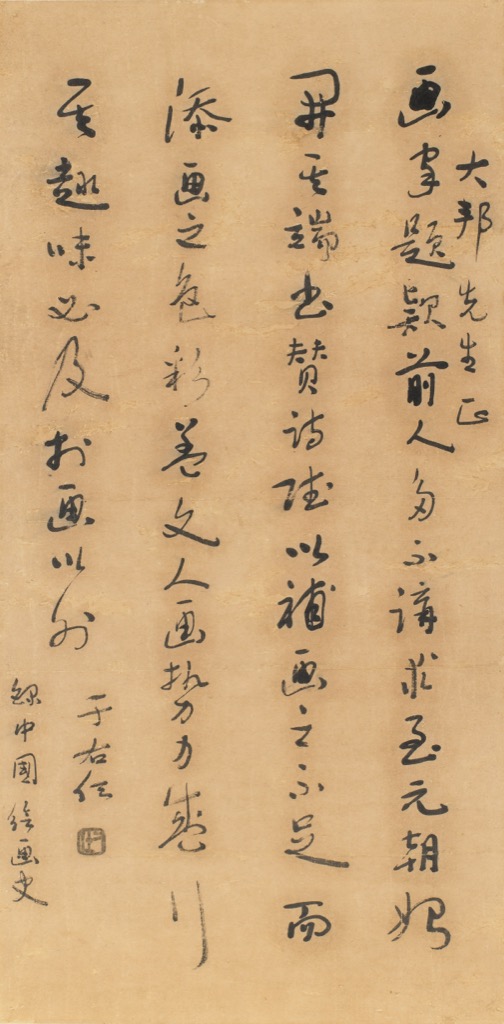 畫家題款,前人多不講求,至元朝始開其端,書、贊、詩、賦以補畫之不足,而添畫之色彩。蓋文人畫勢力盛行,其趣味必及於畫以外。錄中國繪畫史,大邦先生正,于右任。
