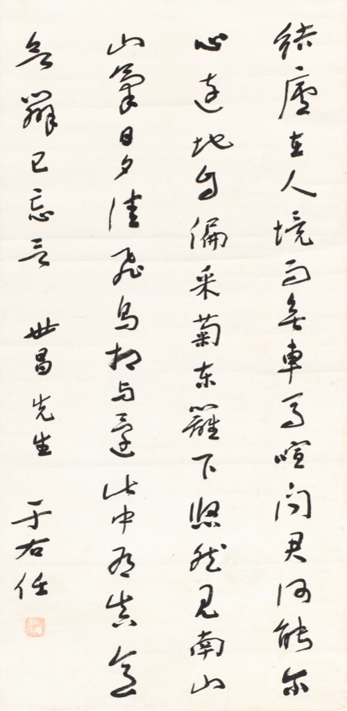 結廬在人境,而無車馬喧。問君何能爾?心遠地自偏。採菊東籬下,悠然見南山。 山氣日夕佳,飛鳥相與還。此中有真意,欲辨已忘言。世昌先生,于右任。