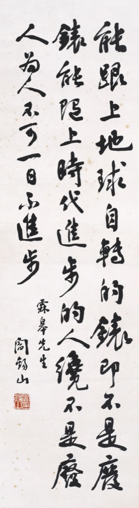 能跟上地球自轉的錶,即不是廢錶;能隨上時代進步的人,纔不是廢人。為人不可一日不進步。霖皋先生,閻錫山。