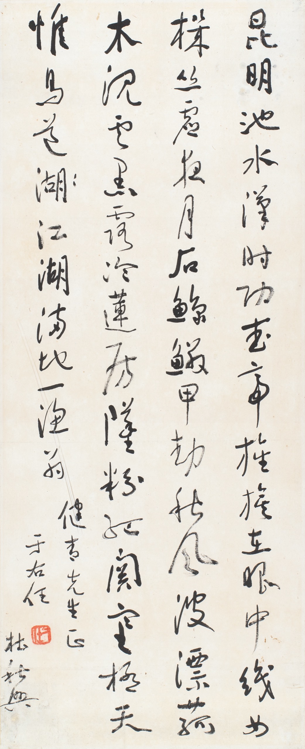 昆明池水漢時功,武帝旌旗在眼中。織女機絲虛夜月,石鯨鱗甲動秋風。波漂菰木沉雲黑,露冷蓮房墜粉紅。關塞極天惟鳥道,江湖滿地一漁翁。健青先生正。于右任。杜秋興。