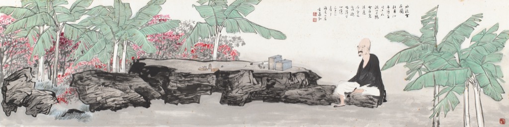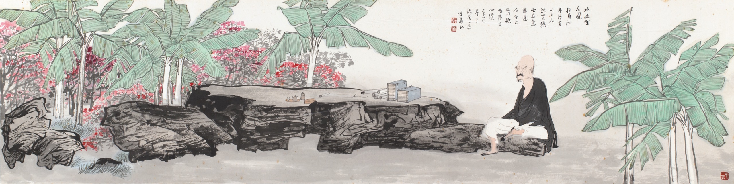 水流雲在圖。杜甫江亭詩有句云:水流心不競,雲在意俱遲。今余之所作概略得?心境。乙亥之春于海尾山居,李義弘。