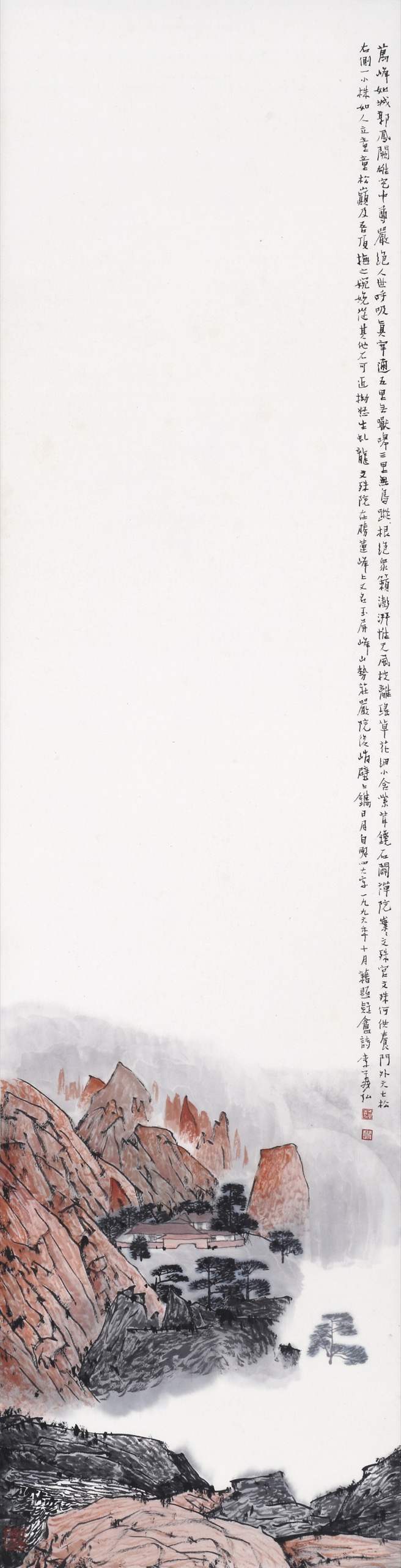 萬峰如城郭,鳳闕雄宅中。尊嚴絕人世,呼吸真宰通。五里無獸嗥,三里無鳥蹤。根絕眾籟,澎湃惟天風。披離瑤草花,細小含紫茸。鑱石闢禪院,嶪嶪文殊官。文殊何供養,門外六七松。右側一小株,如人立童童。松巔及吾頂,撫之婉娩從。其他不可近,拗怒生虬龍。文殊院在勝蓮峰上,又名玉屏峰,山勢莊嚴,院後峭壁上鐫「日月自明」四大字。一九九六年十月藉題疑盫詩,李義弘。
