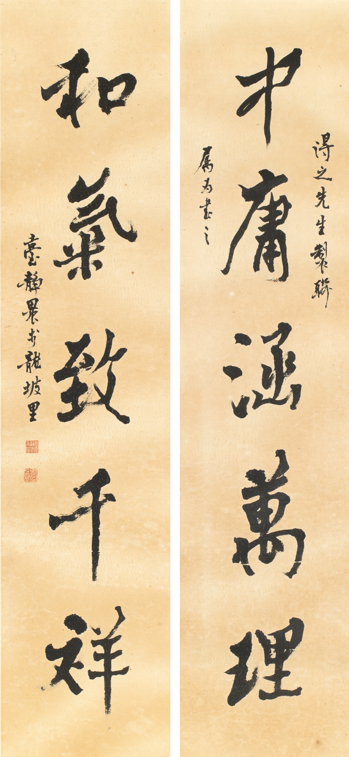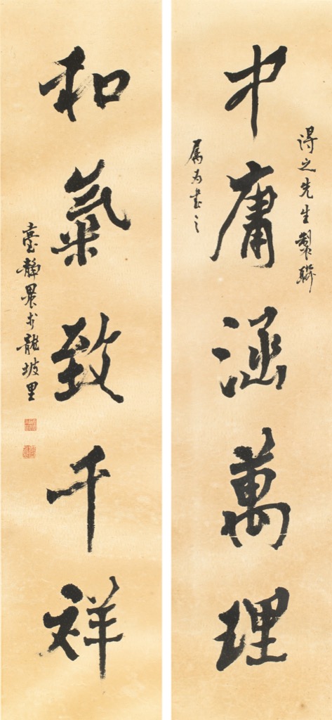 中庸涵萬理,和氣致千祥。得之先生製聯,屬為書之,臺靜農於龍坡里。