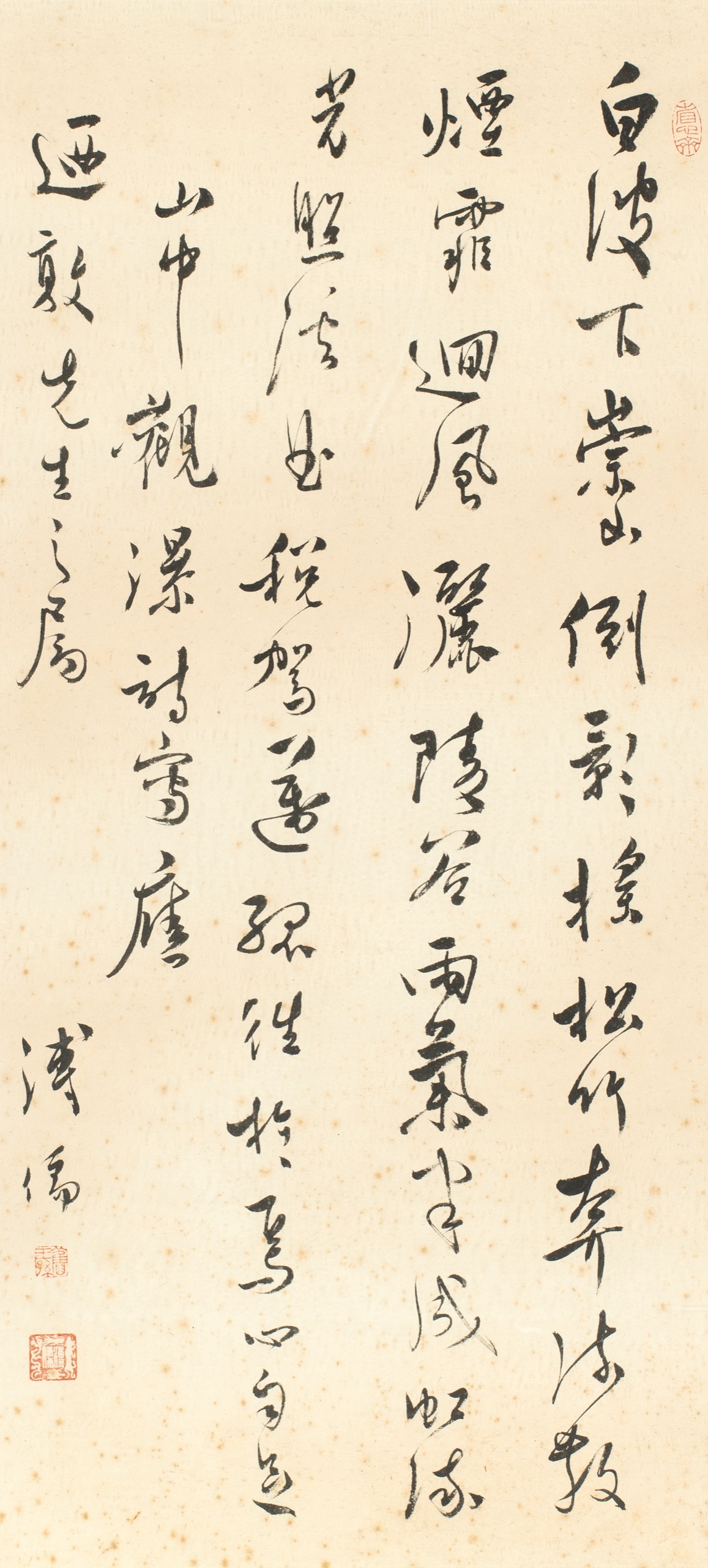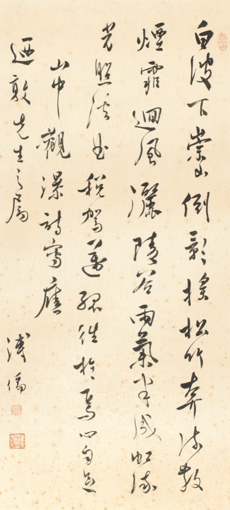 白波下崇山,倒影搖松竹。奔流散煙霏,迴風灑陵谷。雨氣半成虹,流光照溪曲。稅駕邁孤往,於焉心自足。山中觀瀑詩寫應迺敦先生之屬。溥儒。