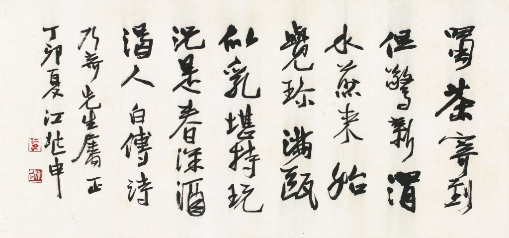 蜀茶寄到但驚新,渭水煎來始覺珍,滿甌似乳堪持玩,況是春深酒渴人。白傅詩,乃奇先生屬正,丁卯夏江兆申。