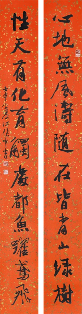 心地無風濤隨在皆青山綠樹,性天有化育觸處都魚躍鳶飛。壬申茮原江兆申書。
