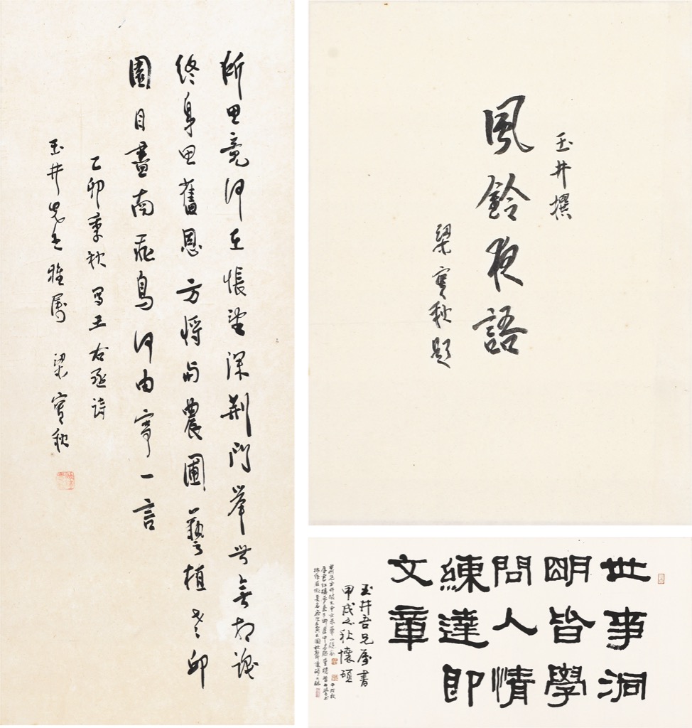 1. 所思竟何在,悵望深荊門。舉世無相識,終身思舊恩。方將與農圃,藝植老丘園。目盡南飛雁,何由寄一言。乙卯1975 季秋,寫王右丞詩,玉井先生雅屬,梁實秋。2. 梁實秋題蕭玉井「風鈴夜語」書名。3. 世事洞明皆學問,人情練達即文章。玉井吾兄屬書,甲戌之秋懷碩。再跋:蕭兄玉井政大中文系畢,小說家,屬書紅樓夢秦子卿房中名聯,重睹昔日學書拙作感慨莫名,歲次壬寅又聞秋聲懷碩又誌。澀盦。