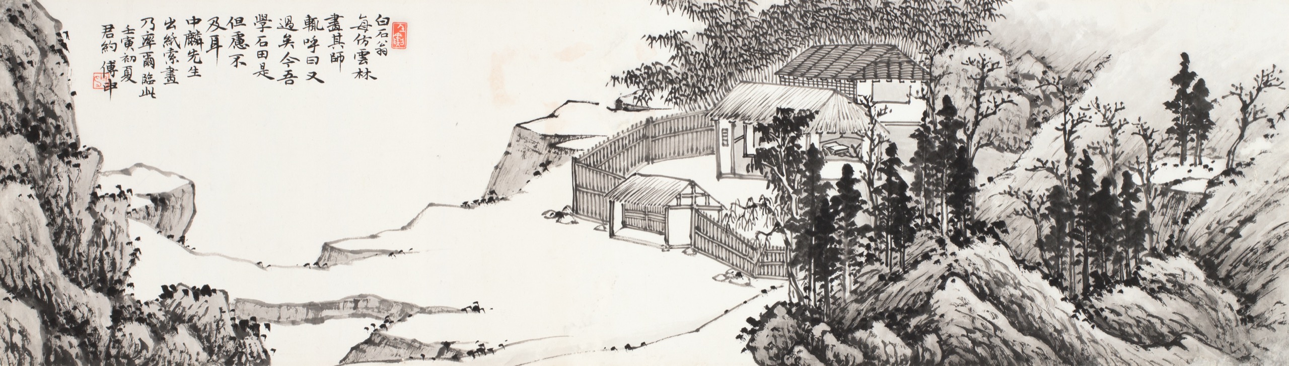 白石翁每仿雲林畫,其師輒呼曰:又過矣!今吾學石田是,但慮不及耳。中麟先生出紙索畫乃率爾臨此。壬寅初夏,君約傅申。
