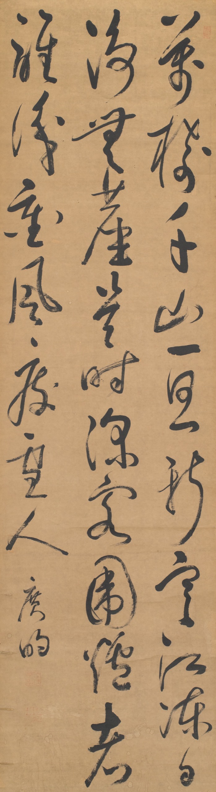 陸廣明出身書畫世家(祖父陸師道、父陸士仁皆大家),草書王維雪渡圖詩軸,此作兼融文徵明秀雅遺風與晚明草書的奔放氣韻,筆勢連綿如風雪捲地,墨色枯潤相生,字體欹側間盡顯「衝風渡雪」的桀驁之態。筆走龍蛇間盡顯明代士大夫孤高氣韻,堪稱詩書合璧的隱逸之作。