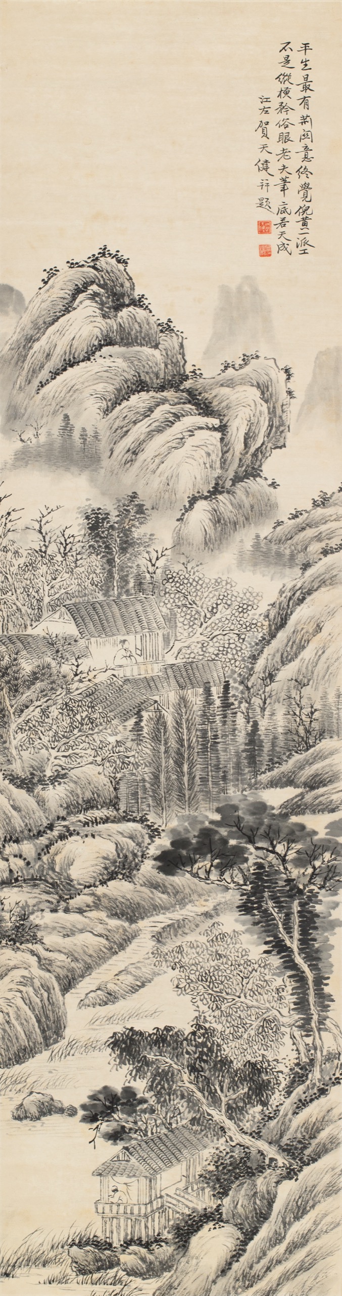 平生最有荊關意,終覺倪黃一派平。不是縱橫矜俗眼,老夫筆底若天成。江左賀天健拜題。