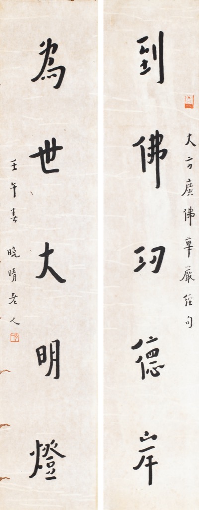 到佛功德岸,為世大明燈。阿彌陀佛(引首肖形印)大方廣佛華嚴經句,壬午春晚晴老人。