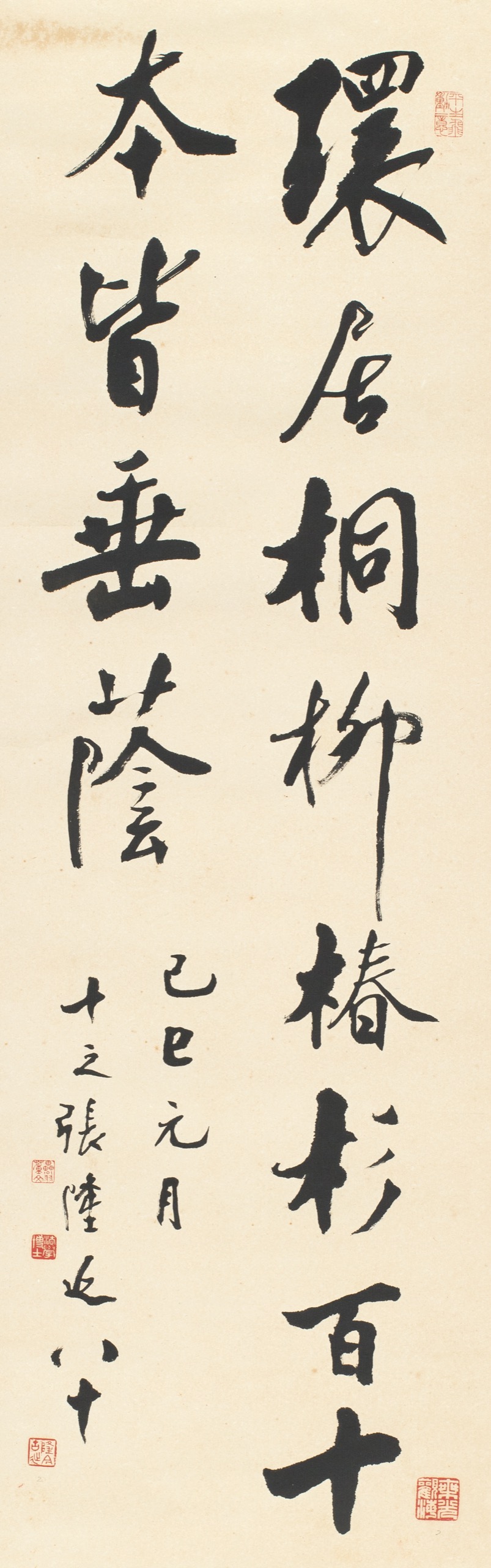 環居桐、柳、椿、杉百十本,皆垂蔭。己巳元月,十之張隆延八十。