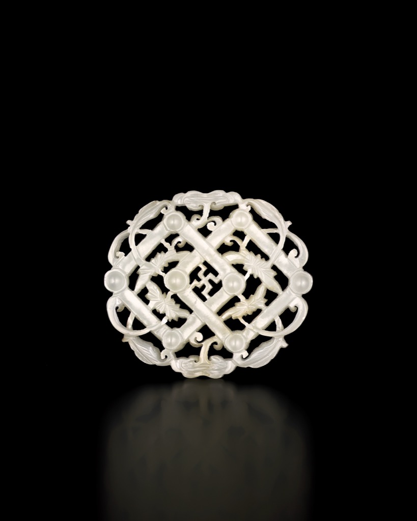 此件珮飾以白玉鏤雕而成,玉色凝潤,肌理細勻,光華內蘊。整器作圓形構圖,內外層次分明,兩面皆施雕工,工藝繁複而秩序井然。通體拋磨精細,邊緣轉折圓融流暢,於繁密結構之中仍見清朗氣息。
