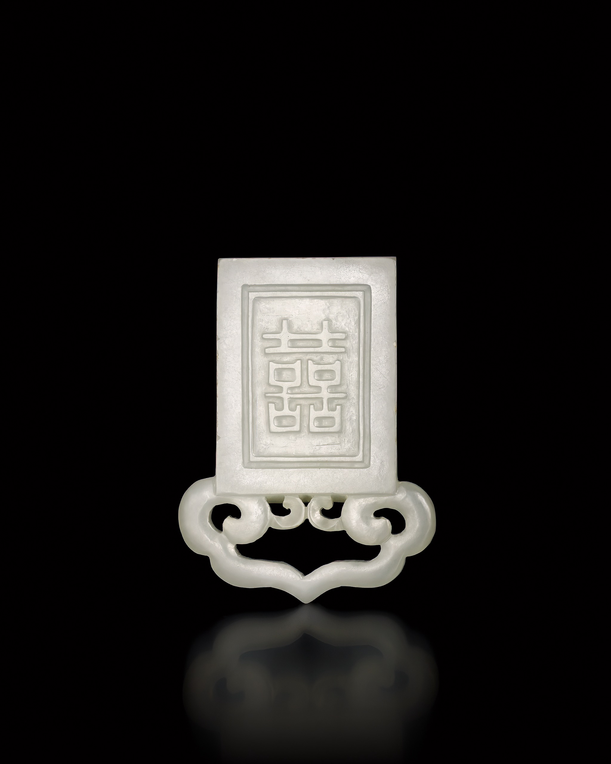 器作上方為方形牌面,內設開光,浮雕「囍」字,筆劃方折分明,結構端整,寓雙喜臨門、吉慶延綿之意。牌面外緣起框,內外層次分明。下承鏤雕如意提頭,曲線舒展婉轉,兩側卷勢對稱呼應,線條起伏如行雲流轉,柔中帶勁。鏤空與實地相間,留白得當,使玉質在光影映照之下呈現清透與厚潤交錯之美。