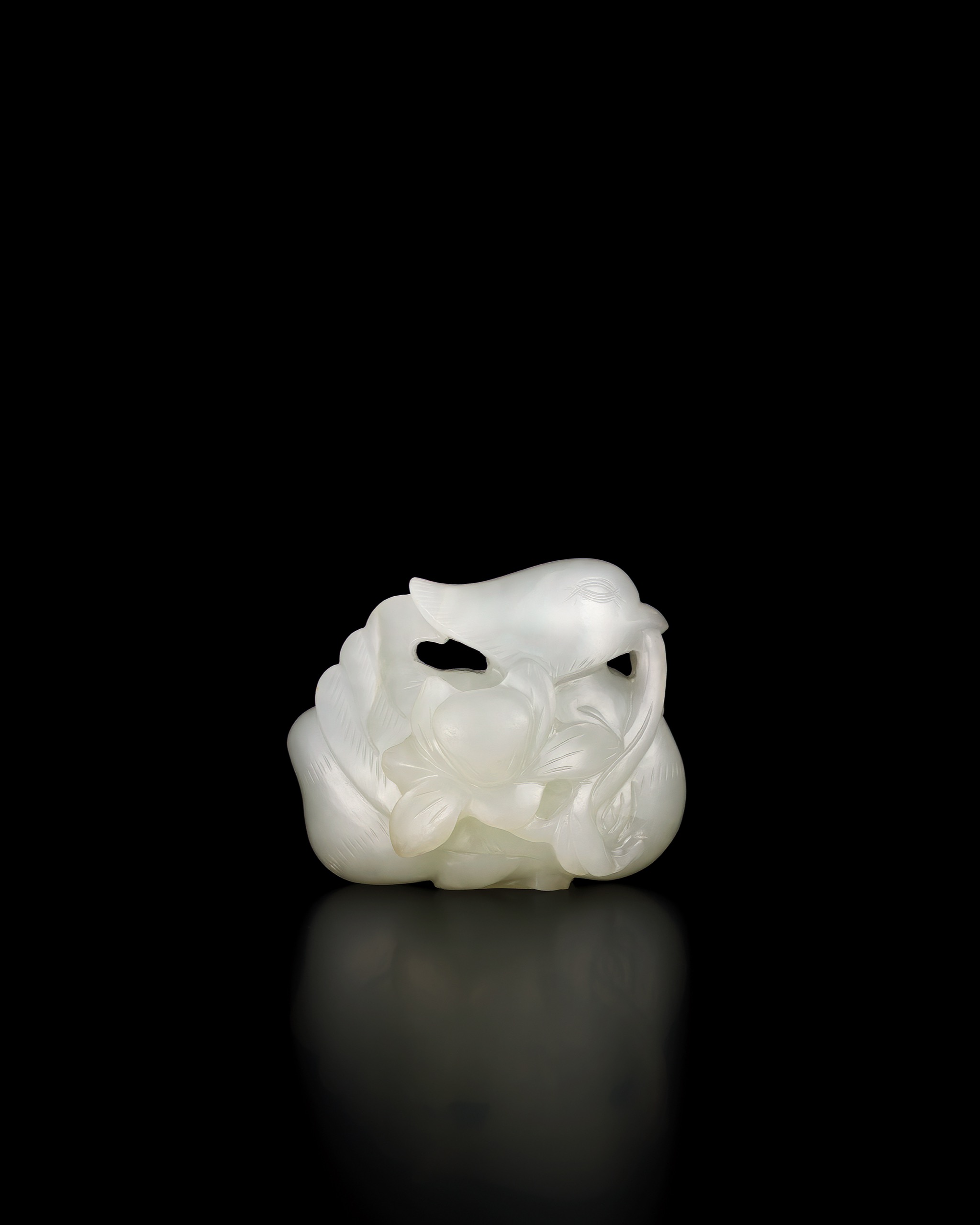 玉質溫凝細潤,色澤澄淨內斂,拋磨圓融而不炫。背面續刻荷葉與翎羽,筋理舒展有致,疏密相間,層次分明。鴛鴦寓和合,蓮取連理清淨之意,鳥銜蓮花,象徵同心相契,祝願含蓄而悠長。