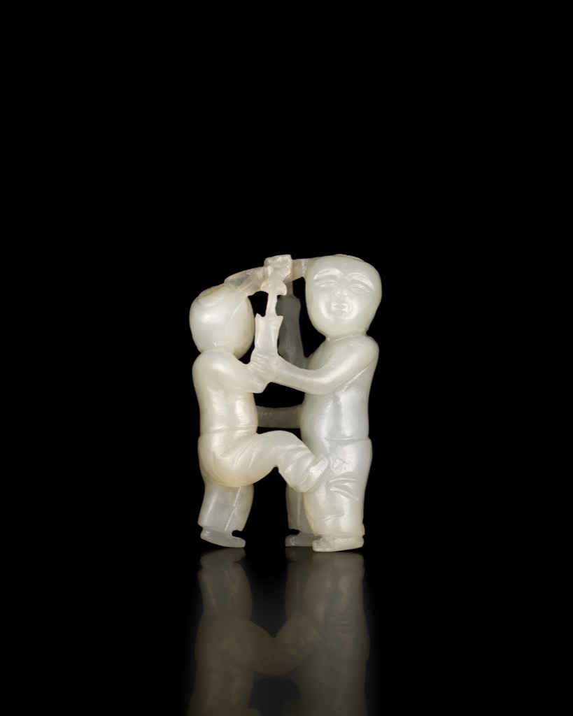 首頁 拍品總覽 2026迎春 share Lot. 1031 清 白玉雙童 NT$ 60,000-80,000RMB¥ 12,000-16,000HK$ 15,000-20,000 媒材/尺寸 H3.2cm 來源 瑞象呈祥―明清圓雕集珍 Lot.1025-1055 賞析 兩童相對而立,一童抬足前踏,雙臂上舉與同伴相扣,姿態活潑生動;另一童側首含笑,神情天真可掬。人物肢體轉折自然,衣褶簡約流暢,整體構圖緊湊而富動感,洋溢嬉戲歡悅之情。 登記競投 返回拍品列表 拍品推薦 1022 清 白玉鏤空鳳紋壽字珮 預估價:NT$ 60,000-80,000 2026迎春 1095 清 白玉龍紋蓋 預估價:NT$ 50,000-80,000 2026迎春 1131 明末清初 纏枝蓮紋如意耳象足方爐 預估價:NT$ 200,000-300,000 2026迎春 1126 清 銅鎏金文殊菩薩 預估價:NT$ 80,000-120,000 2026迎春 1115 明16世紀 黑漆嵌螺鈿柳蔭對奕圖方盒 預估價:NT$ 600,000-1,000,000 2026迎春 1123 清 銅鎏金無量壽佛 預估價:NT$ 120,000-180,000 2026迎春 1150 清 紫檀萬壽紋筆筒 預估價:NT$ 5,000-10,000 2026迎春 1091 清 白玉連鉤雲紋璧 預估價:NT$ 80,000-120,000 2026迎春 1112 天然翡翠麒吐玉書珮 預估價:NT$ 4,200,000-4,800,000 2026迎春 1051 明 青玉鏤空龍紋帶扣 預估價:NT$ 100,000-150,000 2026迎春