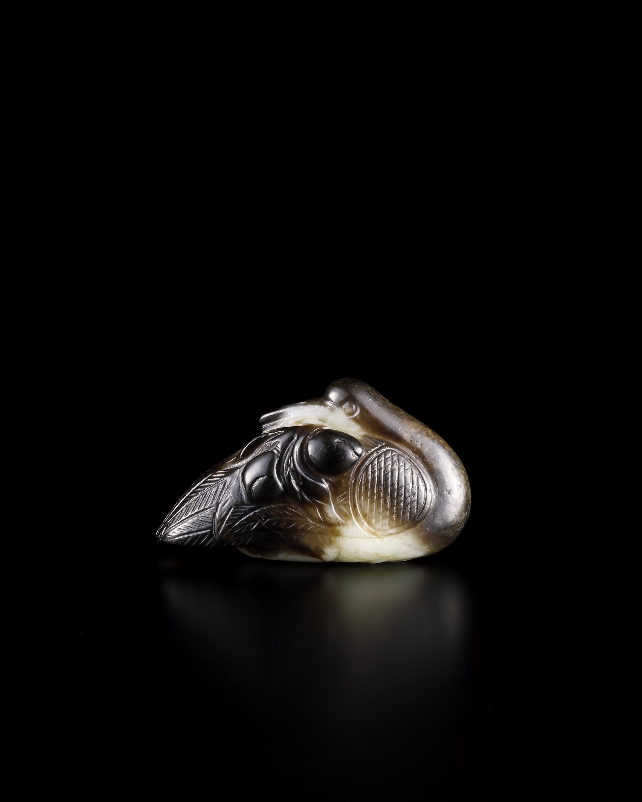 仙鶴側身伏憩,頸項修長微曲,姿態安詳而不失清勁。雙翅貼體收斂,羽毛層層疊刻,長短有序,刀線勁挺而轉折圓融;尾羽斜垂,與身軀流線相互呼應。鶴首微昂,目光澄定,喙銜桃枝,枝梗蜿蜒而上,壽桃圓潤飽滿,果形豐盈,寓意壽祿綿延。