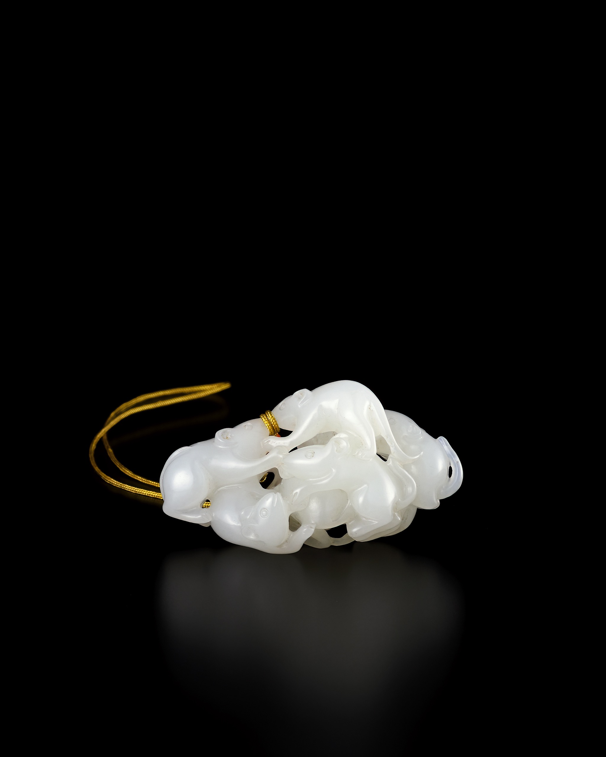 首頁 拍品總覽 2026迎春 share Lot. 1047 民國 白玉靈鼠呈祥 NT$ 50,000-80,000RMB¥ 10,000-16,000HK$ 12,500-20,000 媒材/尺寸 L5.6cm 來源 瑞象呈祥―明清圓雕集珍 Lot.1025-1055 賞析 圓雕七鼠,鼠首尖潤,雙目圓凸,耳廓貼伏,形態靈動可親。彼此攀附嬉戲,或俯首探視,或昂首相望,或回身穿行,動勢相續而不紊。玉色白淨勻雅,質地細膩溫潤,隱現脂澤。整體刀法圓融,轉折自然,形神兼備。鼠善繁衍,七鼠群聚,寓意子嗣綿延、家族昌盛,祥意盎然。 登記競投 返回拍品列表 拍品推薦 1031 清 白玉雙童 預估價:NT$ 60,000-80,000 2026迎春 1052 明 白玉龍紋帶扣 預估價:NT$ 120,000-180,000 2026迎春 1029 清 白玉豆莢 預估價:NT$ 50,000-80,000 2026迎春 1067 明 白玉鏤雕飛魚紋帶板 預估價:NT$ 100,000-150,000 2026迎春 1027 清 白玉劉海戲金蟾 預估價:NT$ 150,000-250,000 2026迎春 1022 清 白玉鏤空鳳紋壽字珮 預估價:NT$ 60,000-80,000 2026迎春 1024 清 白玉螭龍紋盤長形帶扣 預估價:NT$ 80,000-120,000 2026迎春 1107 清乾隆 黃玉三羊開泰水丞 預估價:NT$ 3,000,000-5,000,000 2026迎春 1129 清早期 雲紋錦邊筒式爐 預估價:NT$ 300,000-500,000 2026迎春 1043 清 白玉逍遙童子 預估價:NT$ 80,000-120,000 2026迎春