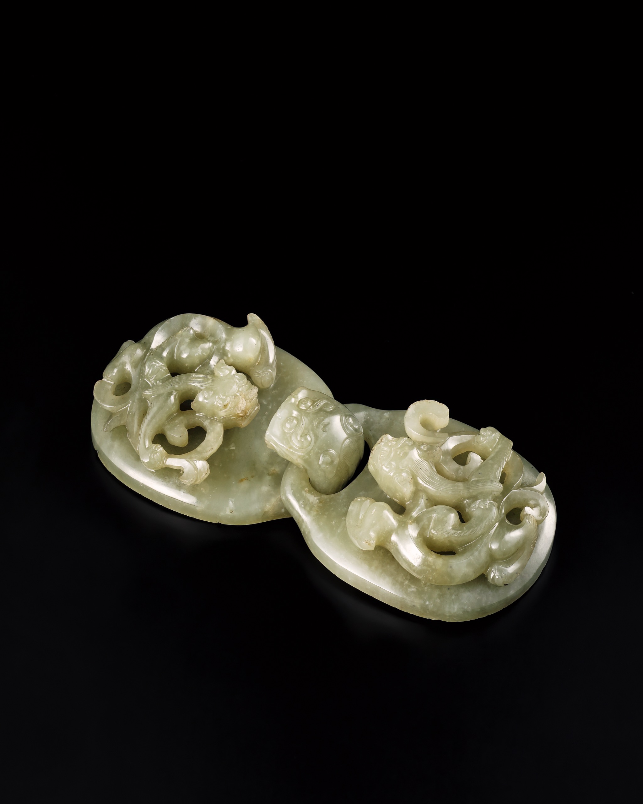 龍紋帶扣以青玉雕琢,玉色蒼潤沉靜,泛深沉橄欖綠意,色調勻厚而含蓄,質地細密緊實,通體拋磨圓熟。帶鉤龍首額部隆起,雙目圓凸有神,眉脊舒展,鼻樑挺直,口微啟而神情凝定,角部簡潔勁健,頷下鬚紋以陰線細刻,刀法爽利。扣面及鉤身鏤雕螭龍盤繞翻轉,首部回望,吻端微翹,身軀弧曲成勢,肢爪內收而富張力;背面皆設素圓扣鈕,比例厚實。整體線條明晰流暢,節奏起伏有致,構圖緊湊而富層次,呈現蒼健渾厚之風格。