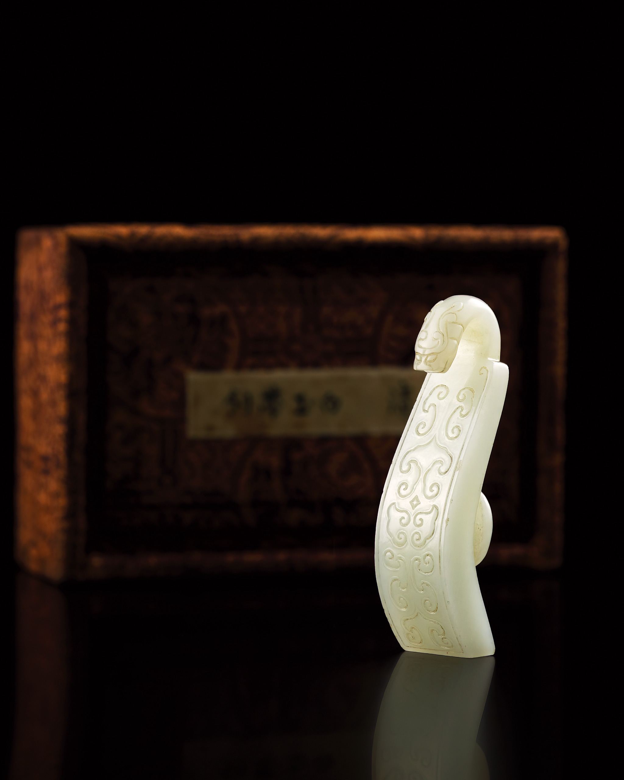 白玉鉤雲紋龍首帶鉤,器形修長微弧,起首隆起而勢轉自然。鉤首雕作龍首,額頂寬平微隆,額際飾以簡化卷雲紋,線條含蓄;雙目橫列微呈杏形,神采內斂而凝聚。鼻樑平直略低,鼻翼舒展,口部收緊成線,下頷方折分明,轉折俐落而具力度。鉤面陰刻鉤雲紋,紋線迴旋流轉,舒卷有致,於素淨玉面上鋪陳出層次節奏。背面設圓鈕以便繫束,位置居中,結構清晰,比例勻稱。通體拋磨細潤,玉色潔白溫雅。配有老錦盒收存,氣息古雅,韻味十足。