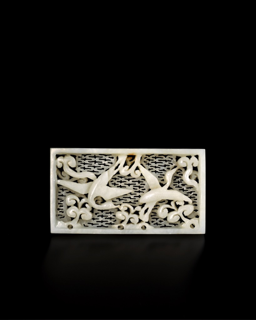 地部滿飾錦紋透雕,以短筆密布成細網,光影穿透其間,虛實互映。雙層透雕使主紋浮現於前,層次清晰而不繁密。背面光素潔淨,僅於鶴身內側打漥減地,以平衡重量並強化正面羽體起伏,技法克制而周密,結構穩健。