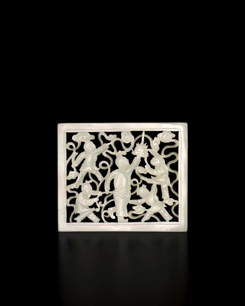 首頁 拍品總覽 2026迎春 share Lot. 1069 清 白玉鏤雕五子登科帶板 NT$ 150,000-250,000RMB¥ 30,000-50,000HK$ 37,500-62,500 媒材/尺寸 L6.8cm 來源 端凝法度―元明帶板精華 Lot.1056-1072 賞析 白玉鏤雕五子登科帶板,玉色潔白清潤,質地緻密,通體高拋光,光澤澄澈。器作方形外框,內鏤雕通透。五童環繞中央人物而動,或奔走揚臂,或持物相迎,衣褶起伏,神情歡悅;上方懸冠帽,點明登科題旨。背景卷雲回旋,線條圓轉流利。整體構圖緊湊而不迫,寓科甲連捷、子孫昌盛。 登記競投 返回拍品列表 拍品推薦 1146 清 白玉花卉紋盃 預估價:NT$ 120,000-180,000 2026迎春 1104 靜公七秩壽禮 尚均款 田黃浮雕洪福紋 「天保九如」隨形章 預估價:NT$ 8,000,000-12,000,000 2026迎春 1003 明 白玉受天百年龍紋珮 預估價:NT$ 30,000-60,000 2026迎春 1100 清 白玉纏枝牡丹紋翎管 預估價:NT$ 80,000-120,000 2026迎春 1141 清 乾隆款朱泥扁圓壺 預估價:NT$ 180,000-220,000 2026迎春 1076 良渚文化 青玉錐形器 預估價:NT$ 80,000-120,000 2026迎春 1044 清 白玉伏虎羅漢 預估價:NT$ 120,000-180,000 2026迎春 1082 遼/金 青白玉鴛鴦 預估價:NT$ 80,000-120,000 2026迎春 1070 明 白玉龍紋鉈尾 預估價:NT$ 120,000-180,000 2026迎春 1030 清 白玉童子 預估價:NT$ 50,000-80,000 2026迎春