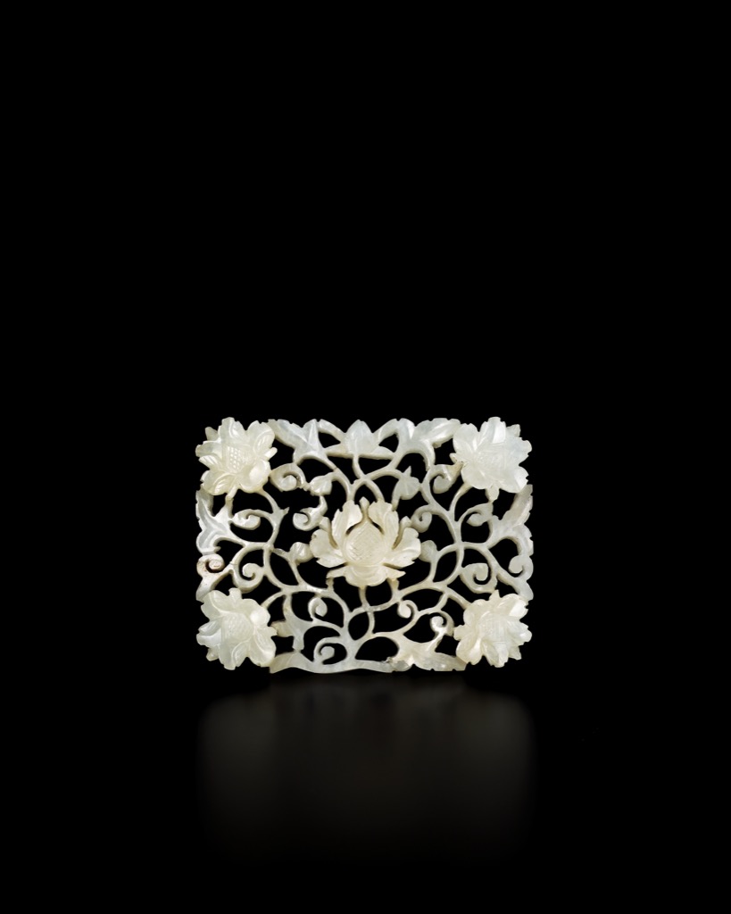此件白玉透雕牡丹紋飾件,作長方形構形,通體鏤空雕琢。中央一朵盛放牡丹為視覺核心,花瓣層層舒展,起伏分明,花心細刻網格紋理,形態飽滿而不流於繁縟;四周纏枝卷草縈繞回旋,枝蔓翻轉有致,疏密互映。四角各置牡丹一朵,與中央主花遙相呼應,形成主從分明之佈局,構圖端整而富節奏,層次清晰。