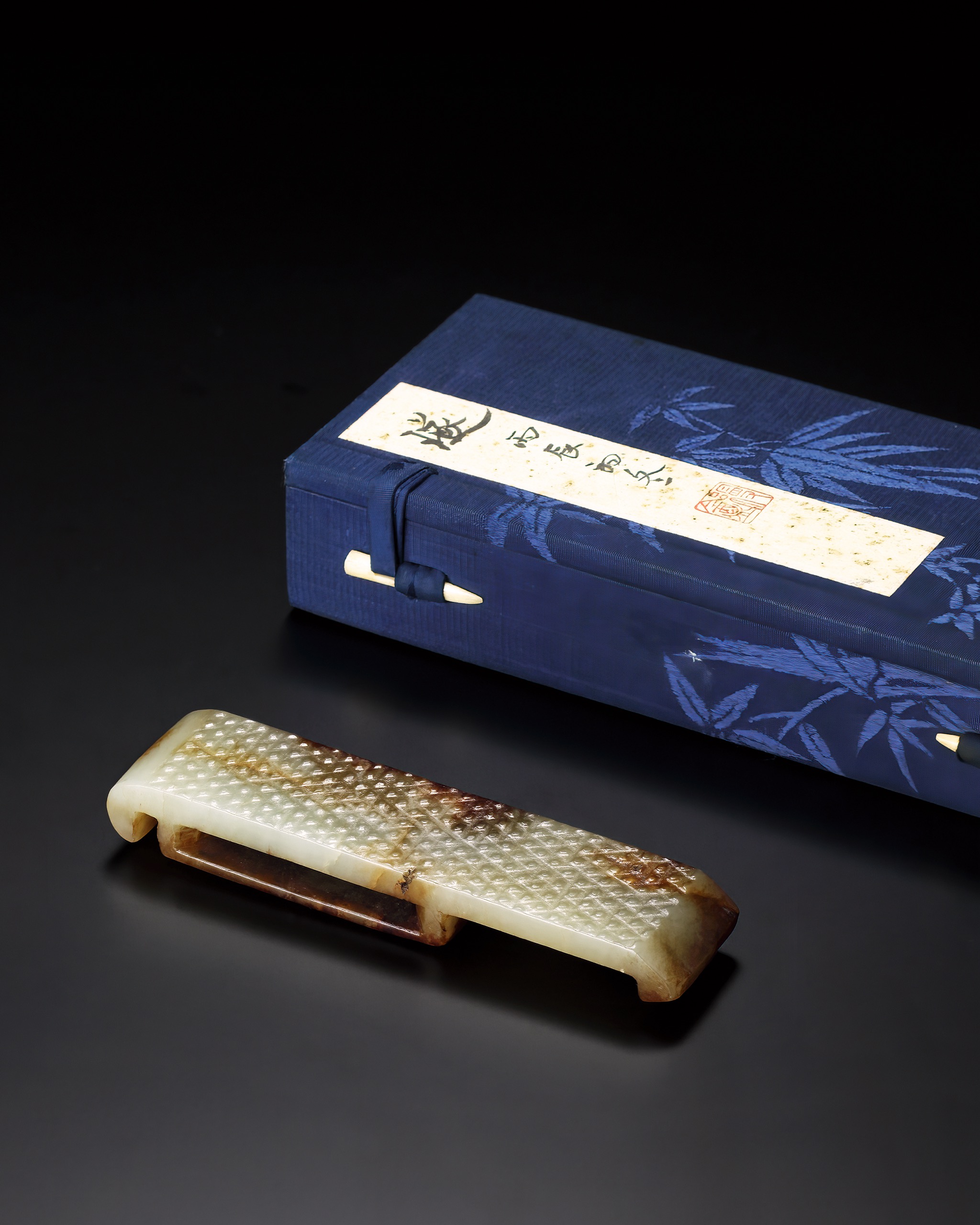 直至明代,玉製劍飾形制多轉為文化復興與文人雅賞之物,重在承襲古制與審美轉化。本件玉質青白溫潤,肌理細密,通體施提油巧色,使赭紅至棕褐色沿表層與天然紋隙暈染滲入,層層過渡,自然銜接,與原生玉色相映成趣。磨治細膩,轉折圓融,於厚實體量中呈現溫潤質感,氣息沉穩古雅。