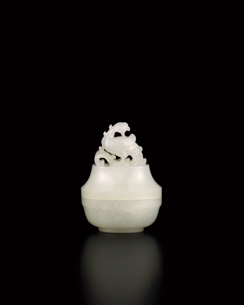 鳳凰為祥瑞之禽,象徵高潔與太平。此件鳳鈕與素淨盒身相映,繁簡對比鮮明。整器造型嚴整,比例得宜,雕工精謹,靜中見章法。此類鳳鈕白玉蓋盒題材本不多見,而形制完整、神采俱足者尤為難得。
