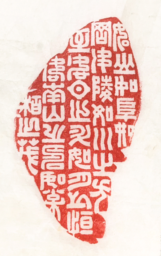章體因石就勢,隨形起制。整體呈低伏丘壑之態,上寬下穩,重心沉著,輪廓圓融而不失骨力。印頂起伏如層巒疊嶂,左右呼應,天然石形與雕刻構圖渾然相生。印身四面不刻意求方,而於轉折之處保留原石勢度,使章法與自然並行,格調沉穩端凝。此種隨形之制,非徒技藝所能,實賴對石性紋理之洞察與比例節奏之掌握。