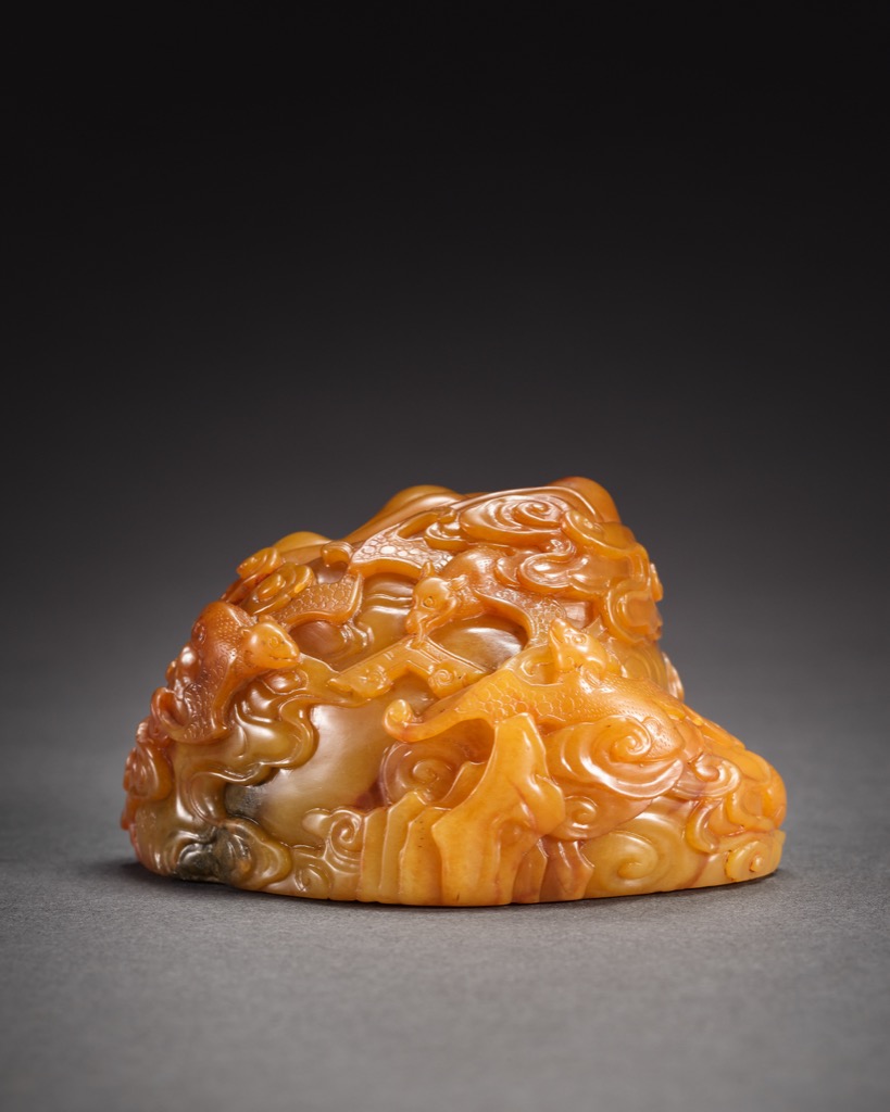本件尚均款田黃浮雕洪福紋「天保九如」隨形章,以上乘壽山田黃石琢製而成。石質溫潤凝膩,色澤純厚而不浮艷。通體以蜜黃為宗,黃中微泛橘金暈彩,光澤由內而外層層滲透,溫厚若熟蠟,內蘊而不張。轉側之間,石肌隱見細密結晶與天然石格,如雲影流轉、山骨含黛,使色、沁、透、膩彼此交融,在沉靜之中自成氣韻。