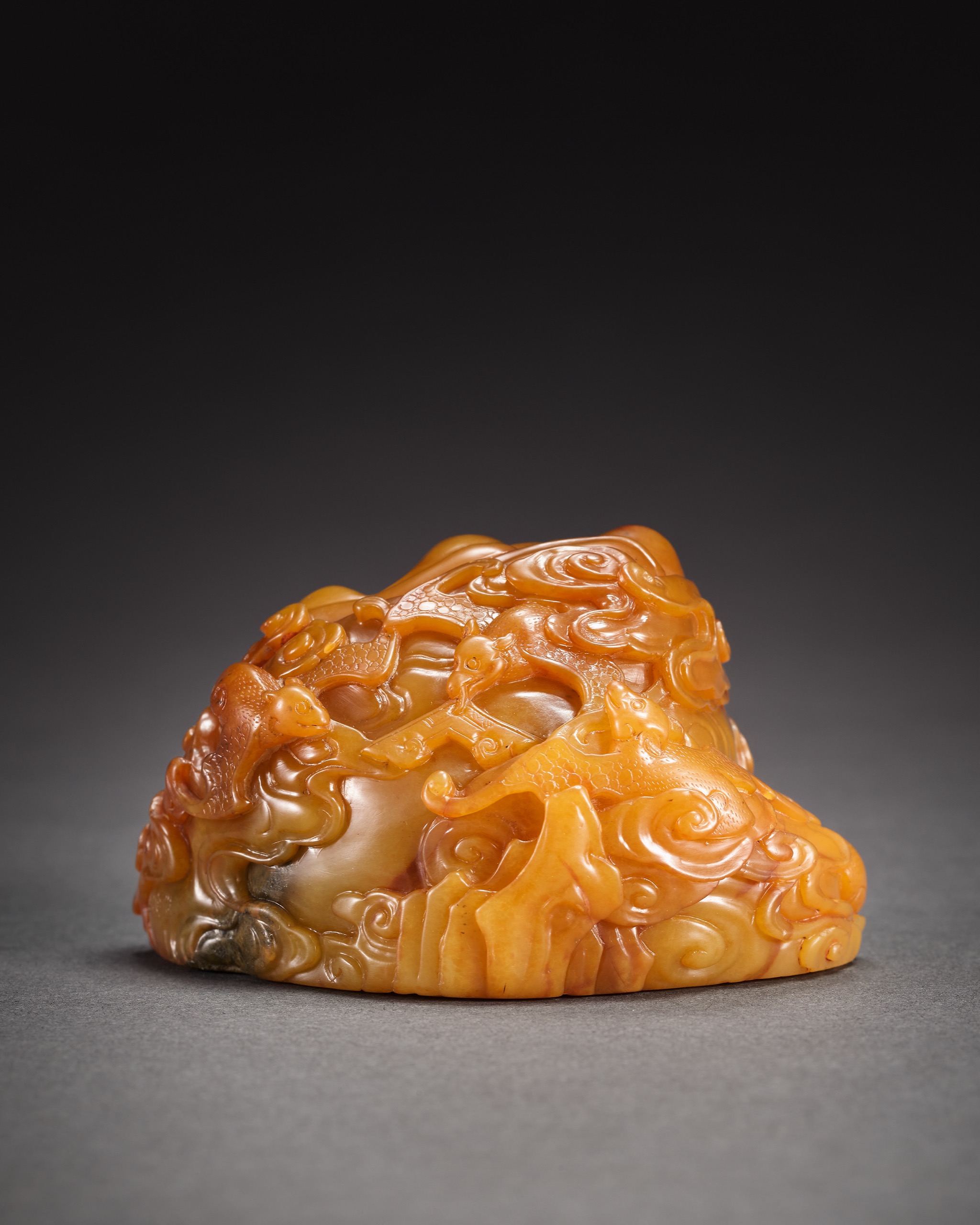 雕工以高浮雕統攝全器,刀法遒勁而流暢。山巒起伏減地成勢,層層遞進,線條收放有度,既見鋒芒爽利,亦含圓轉之柔。雲氣翻湧,卷舒自若,銜接處圓潤無痕。蝙蝠以圓刀推挽成形,翼膜薄而不浮,筋脈起伏自然,神態靈動,氣韻貫通全章。