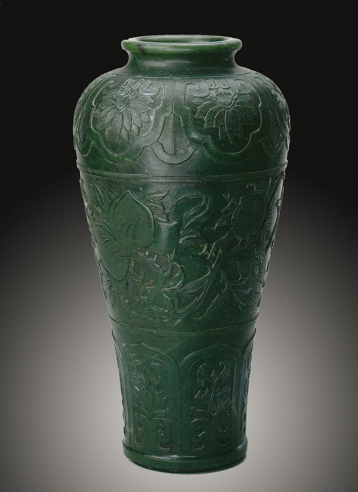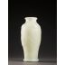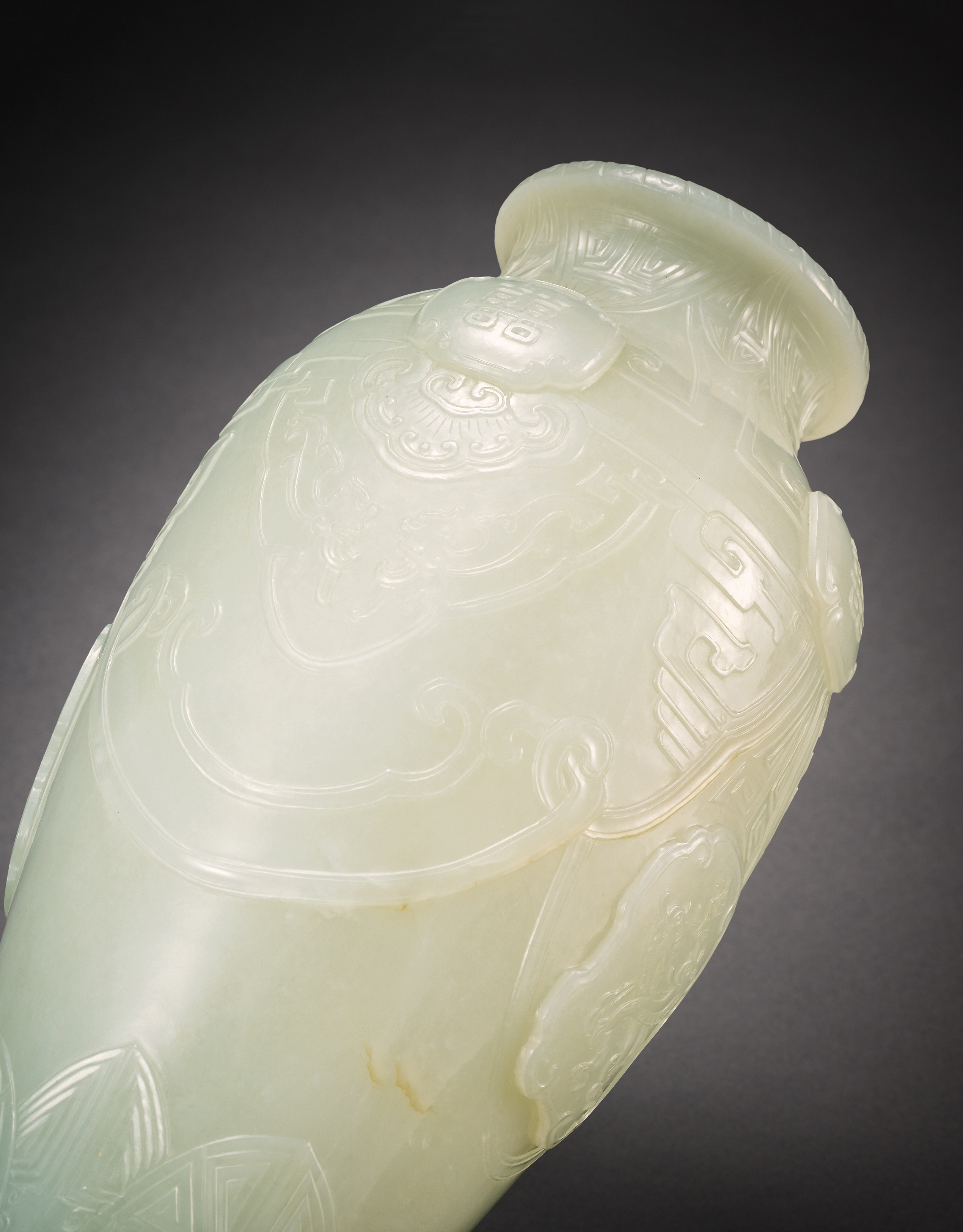 本件清乾隆白玉瓶,由和闐玉美玉精雕而成,玉質凝潔潤雅,色澤純白清朗,體量宏碩,器形挺拔莊嚴,氣度雍容不凡。通體雕飾章法嚴整,瓶肩對稱浮雕四組「囍」字團紋,環飾如意與夔龍紋,構圖繁縝,氣脈貫通,寓喜慶延年之瑞意;瓶腹兩側對稱開光,內飾「卍」字、綬帶與鯰魚,構成「福壽萬年」主題,寓長壽富貴、萬年安泰之吉祥,盡顯乾隆朝玉雕構制之嚴謹與美學意涵之完備。