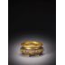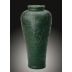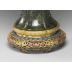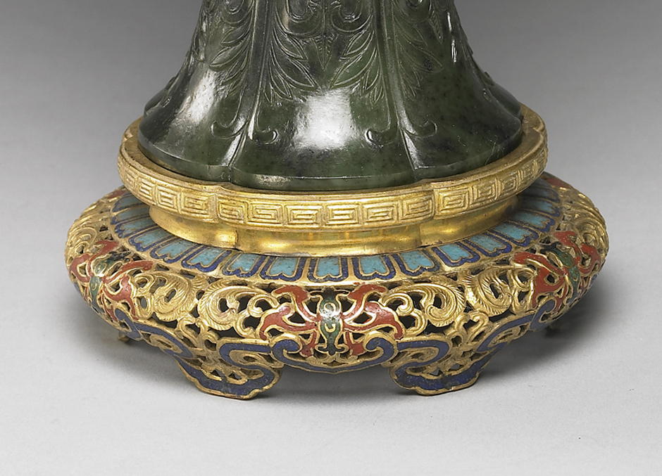 銅鎏金琺瑯器座,座身鏤雕纏枝牡丹,層層翻卷之瓣葉舒展生姿, 並施藍地琺瑯釉彩,光澤瑩澈,與鎏金相映成輝,燦然輝耀。器座結 構嚴整,紋飾華麗,與瓶體一氣呵成,精美絕倫。
