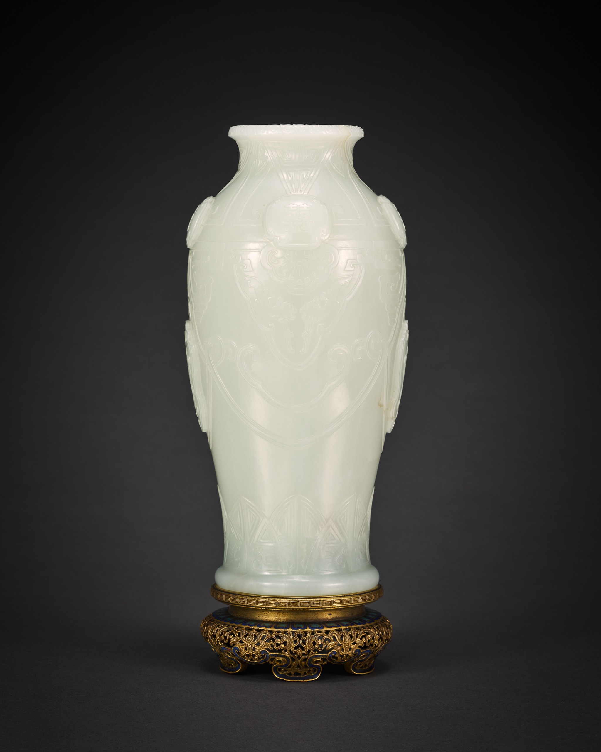 清乾隆 御製白玉「福壽萬年」喜字瓶 帶造辦處銅鎏金琺瑯座