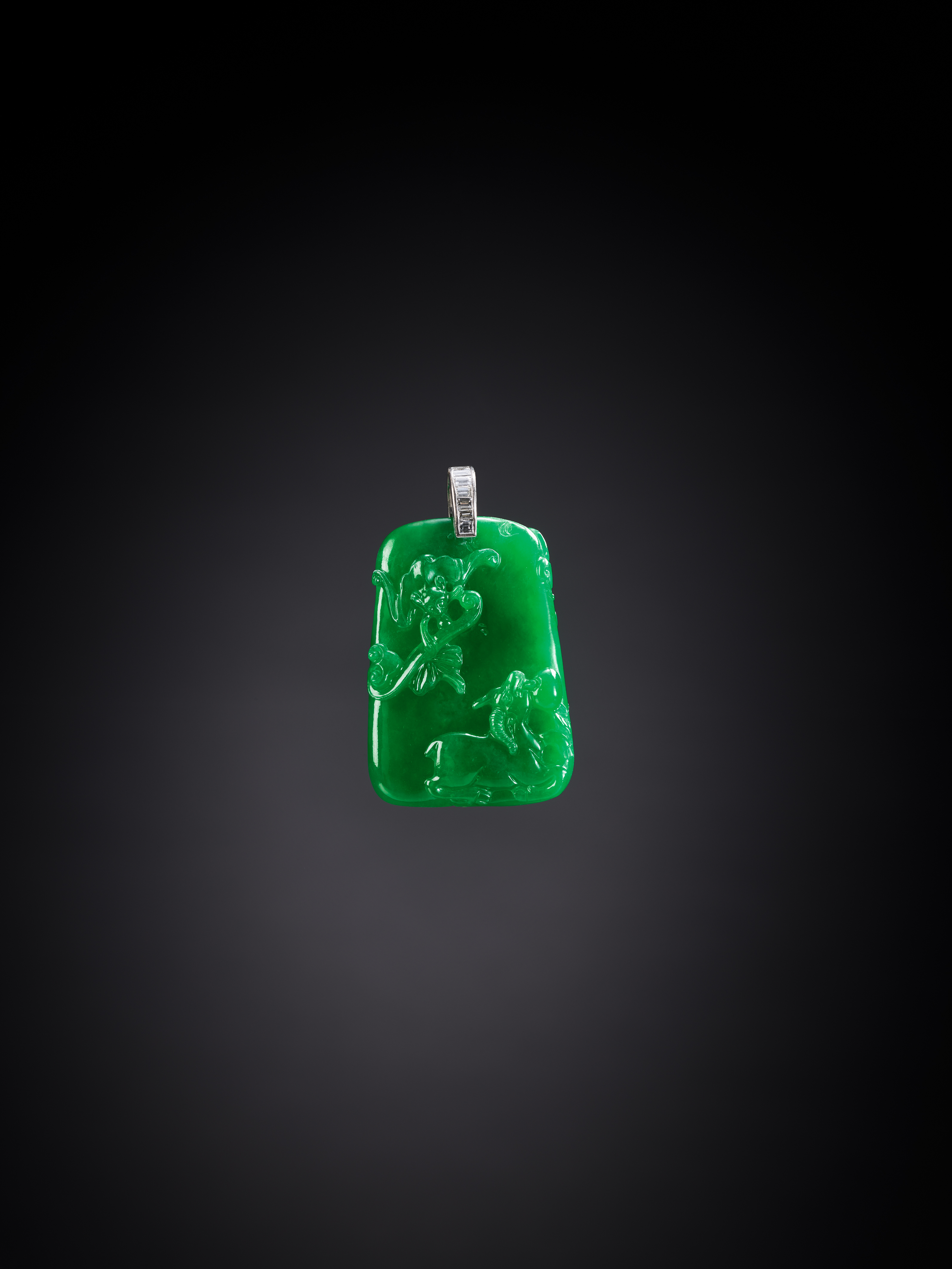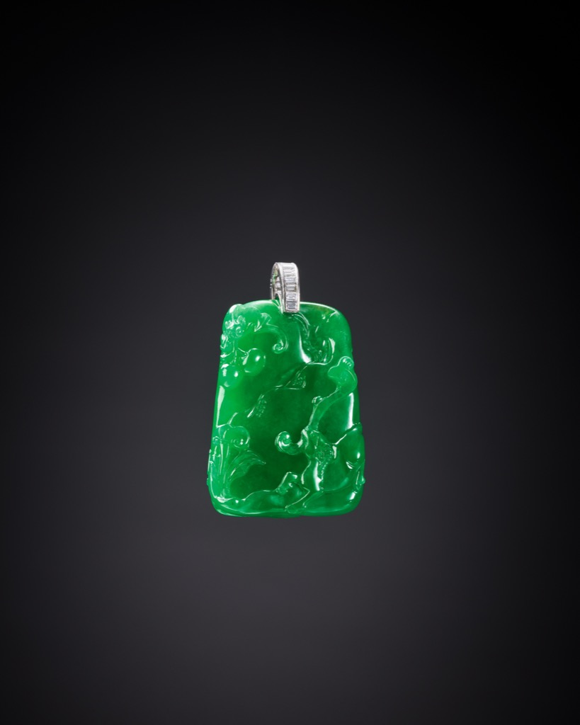 本件翡翠牌以上等翡翠整料琢製,玉質堅結細膩,結構緊密,斷面見細微纖維交錯,水潤凝脂,透光度高,質感沉穩厚實。全器體量飽滿,邊緣處修整圓潤,打磨細緻,手感溫潤滑膩,為翡翠中難得之精材。色澤通體呈鮮明陽綠,翠色濃郁鮮亮,分佈勻淨而不雜,色根穩定,在光線照映下,泛映內斂柔光,轉動間翠華閃動,種老水足。