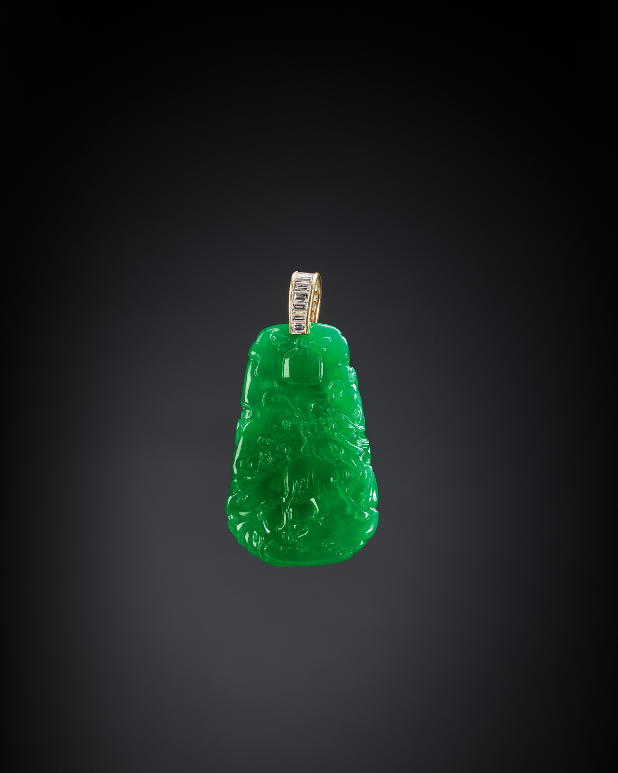 本件翡翠珮取整料雕琢而成,通體呈鮮明陽綠色,色澤濃艷而不失清透,翠色純正,色根勻淨,微帶水光,隨光轉動間泛出柔潤內光,映現出上佳之種水條件。玉質細膩緻密,質感凝結沉穩,表面拋磨圓潤光潔,整體觀感鮮明悅目。
