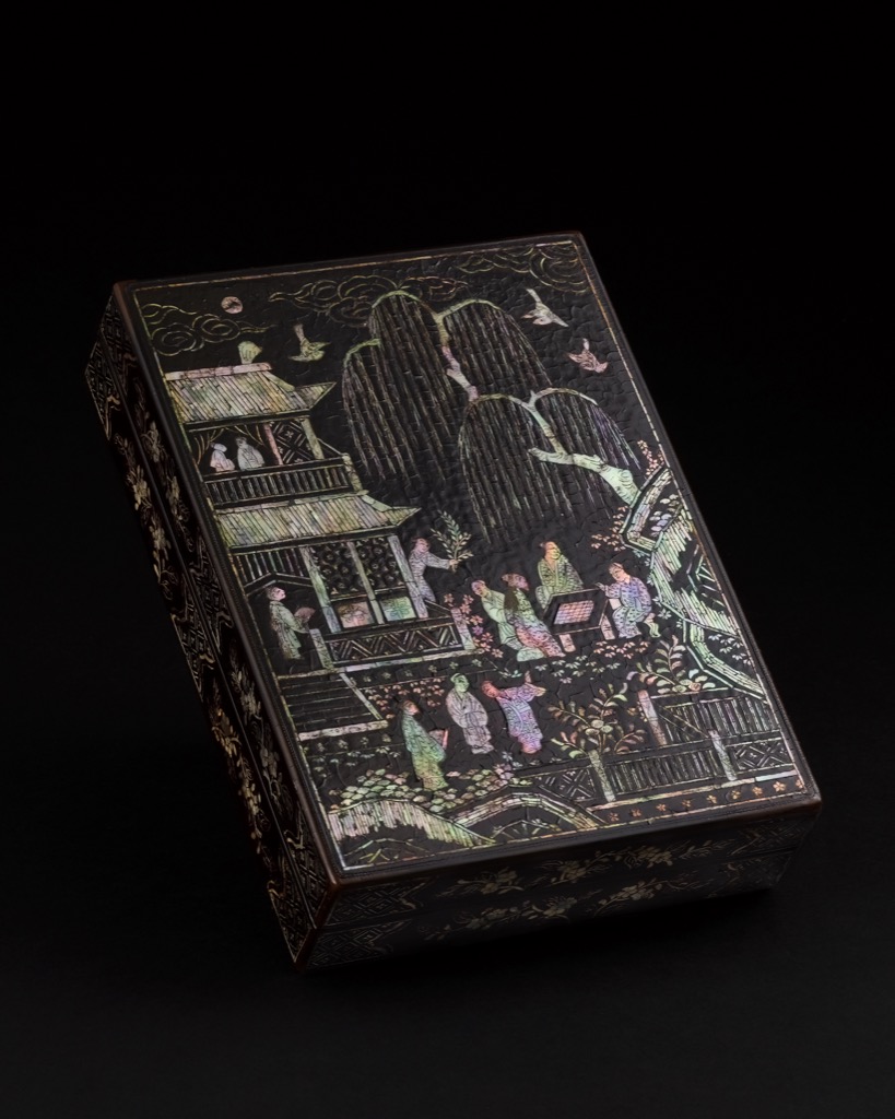 明16世紀 黑漆嵌螺鈿柳蔭對奕圖方盒
